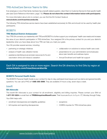 TRS-ActiveCare Service Teams for BAs If an employee or one of their family members has a benefit-related question, direct them to Customer Service for their specific health plan (see Quick Reference Information, page 7-9). Please do not share the contact information below with participants. For more information about who to contact, you can find the DA Contact Guide at www.bcbstx.com/trsactivecareba/da.The following TRS-ActiveCare service teams have been established exclusively for BAs and should not be used by health plan participants.BCBSTXTRS Medical District AmbassadorYour TRS DA connects your leadership with TRS and BCBSTX to further support your employees%u2019 health care needs and increase the value of your district%u2019s participation in TRS-ActiveCare. Your assigned DA is the primary contact for you and your district%u2019s leadership when you have ideas about how TRS can help you meet your goals.Your DA provides several services, including: %u2022 partnering on strategic initiatives%u2022 analysis of health care utilization trends%u2022 assistance identifying local and plan resources for flu and vaccination clinics and tobacco cessation%u2022 collaboration on solutions to reduce health care costs%u2022 presentations for your administration and employees about plan benefits and wellness topics%u2022 Annual Enrollment and health fair supportEach DA is assigned to one or more region. Search the DA directory to find DAs by region at www.bcbstx.com/trsactivecareba/da.BCBSTX Personal Health GuideThe BCBSTX Personal Health Guide is your contact for day-to-day, participant-level issues such as claims and general benefits questions. You can call a PHG at 1-866-355-5999. They are available 24 hours a day, seven days a week. bswiftBA AdvocateThe bswift BA Advocate is your contact for all enrollment, eligibility and billing inquiries. Please contact your BAA at 1-877-767-5254 or email them at TRSBAinquiries@bswift.com. Their hours are 8 a.m. to 5 p.m. CT, Monday through Friday.Your BAA helps with:%u2022 enrollment discrepancies and eligibility guidelines%u2022 bill inquiries and reporting discrepancies%u2022 exceptions%u2022 COBRA inquiries for TRS-ActiveCare plans10 www.bcbstx.com/trsactivecareba