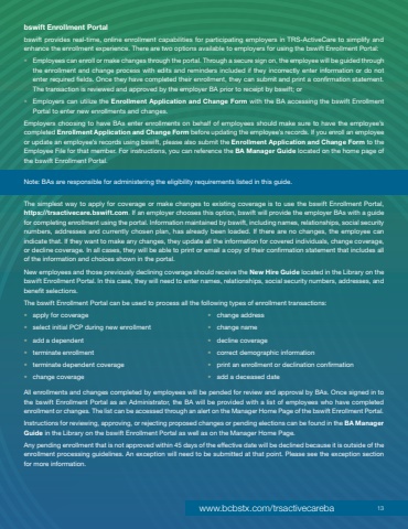 bswift Enrollment Portalbswift provides real-time, online enrollment capabilities for participating employers in TRS-ActiveCare to simplify and enhance the enrollment experience. There are two options available to employers for using the bswift Enrollment Portal:%u2022 Employees can enroll or make changes through the portal. Through a secure sign on, the employee will be guided through the enrollment and change process with edits and reminders included if they incorrectly enter information or do not enter required fields. Once they have completed their enrollment, they can submit and print a confirmation statement. The transaction is reviewed and approved by the employer BA prior to receipt by bswift; or%u2022 Employers can utilize the Enrollment Application and Change Form with the BA accessing the bswift Enrollment Portal to enter new enrollments and changes.Employers choosing to have BAs enter enrollments on behalf of employees should make sure to have the employee%u2019s completed Enrollment Application and Change Form before updating the employee%u2019s records. If you enroll an employee or update an employee%u2019s records using bswift, please also submit the Enrollment Application and Change Form to the Employee File for that member. For instructions, you can reference the BA Manager Guide located on the home page of the bswift Enrollment Portal.Note: BAs are responsible for administering the eligibility requirements listed in this guide.The simplest way to apply for coverage or make changes to existing coverage is to use the bswift Enrollment Portal, https://trsactivecare.bswift.com. If an employer chooses this option, bswift will provide the employer BAs with a guide for completing enrollment using the portal. Information maintained by bswift, including names, relationships, social security numbers, addresses and currently chosen plan, has already been loaded. If there are no changes, the employee can indicate that. If they want to make any changes, they update all the information for covered individuals, change coverage, or decline coverage. In all cases, they will be able to print or email a copy of their confirmation statement that includes all of the information and choices shown in the portal.New employees and those previously declining coverage should receive the New Hire Guide located in the Library on the bswift Enrollment Portal. In this case, they will need to enter names, relationships, social security numbers, addresses, and benefit selections.The bswift Enrollment Portal can be used to process all the following types of enrollment transactions:%u2022 apply for coverage%u2022 select initial PCP during new enrollment%u2022 add a dependent%u2022 terminate enrollment%u2022 terminate dependent coverage%u2022 change coverage%u2022 change address%u2022 change name%u2022 decline coverage%u2022 correct demographic information %u2022 print an enrollment or declination confirmation%u2022 add a deceased dateAll enrollments and changes completed by employees will be pended for review and approval by BAs. Once signed in to the bswift Enrollment Portal as an Administrator, the BA will be provided with a list of employees who have completed enrollment or changes. The list can be accessed through an alert on the Manager Home Page of the bswift Enrollment Portal.Instructions for reviewing, approving, or rejecting proposed changes or pending elections can be found in the BA Manager Guide in the Library on the bswift Enrollment Portal as well as on the Manager Home Page.Any pending enrollment that is not approved within 45 days of the effective date will be declined because it is outside of the enrollment processing guidelines. An exception will need to be submitted at that point. Please see the exception section for more information.www.bcbstx.com/trsactivecareba 13