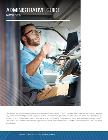 TRS-ActiveCare is administered by Blue Cross and Blue Shield of Texas. BCBSTX provides claims payment and does not assume any financial risk or obligation with respect to claims. Prescription drug benefits for TRS-ActiveCare plans are administered by Express Scripts by Evernorth%u00ae. HMO plans are provided by BCBSTX. Enrollment and billing services are provided by bswift%u00ae. TRS-ActiveCare COBRA administration is provided by bswift for BCBSTX plans. The HMO plans administer COBRA for HMO enrollments.ADMINISTRATIVE GUIDE March 20252 www.bcbstx.com/trsactivecareba
