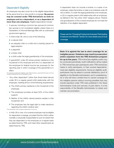 Dependent EligibilityAn employee may also cover his or her eligible dependents at the same time he or she enrolls in coverage. No person may be covered under TRS-ActiveCare as both an employee and as a dependent, or as a dependent of more than one employee. Eligible dependents include:%u2022 A spouse, including a common law spouse (A common law spouse is not considered eligible unless there is a Declaration of Informal Marriage filed with an authorized government agency.)%u2022 A child under 26, who is one of the following:%u2022 a natural child%u2022 an adopted child or a child who is lawfully placed for legal adoption%u2022 a stepchild%u2022 a foster child%u2022 a child under the legal guardianship of the employee%u2022 A grandchild* under 26 whose primary residence is the household of the employee and who is a dependent of the employee for federal income tax purposes for the reporting year in which coverage of the grandchild is in effect.*For purposes of dependent eligibility under TRS-ActiveCare, a grandchild that does not fit into the above definition and is not considered a child.%u2022 %u201cAny other dependent%u201d (other than those listed above) under 26 in a regular parent-child relationship with the employee, meeting all four of the following requirements:%u2022 The child%u2019s primary residence is the household of the employee;%u2022 The employee provides at least 50% of the child%u2019s support;%u2022 Neither of the child%u2019s natural parents resides in that household; and%u2022 The employee has the legal right to make decisions regarding the child%u2019s medical care.**This requirement does not apply to dependents 18 and over.%u2022 A child, 26 or over, of a covered employee may be eligible for dependent coverage, provided that the child is either mentally or physically incapacitated to such an extent that they are dependent on the employee on a regular basis as determined by TRS, and meet other requirements as determined by TRS.A dependent does not include a brother or a sister of an employee, unless the brother or sister is an individual under 26 who is either: (1) under the legal guardianship of an employee, or (2) in a regular parent-child relationship with an employee, as defined in the %u201cany other child%u201d category above. Parents and grandparents of the covered employee do not meet the definition of an eligible dependent.Please see the %u201cChanging Employment between Participating Employers and Rehires%u201d section for more details around dual coverage.Note: It is against the law to elect coverage for an ineligible person. Violations may result in prosecution and/or expulsion from the TRS-ActiveCare program for up to five years. TRS-ActiveCare eligibility audits may be conducted periodically. Audit notifications will be mailed to TRS-ActiveCare plan participants when TRS-ActiveCare needs to verify participants, or their covered dependents, meet plan eligibility requirements. During an eligibility audit, participants may be asked to provide satisfactory proof of eligibility to the Benefits Administrator, and if unsatisfactory, he or she will have a limited time to cancel coverage for the ineligible persons without incurring penalties that may include expulsion under TRS rules published in the Texas Administrative Code and recovery of paid claims. It is the responsibility of the Benefits Administrator to obtain and maintain documentation.20 www.bcbstx.com/trsactivecareba