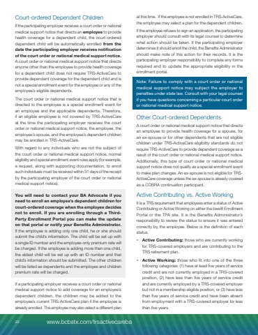 Court-ordered Dependent ChildrenIf the participating employer receives a court order or national medical support notice that directs an employee to provide health coverage for a dependent child, the court-ordered dependent child will be automatically enrolled from the date the participating employer receives notification of the court order or national medical support notice. A court order or national medical support notice that directs anyone other than the employee to provide health coverage for a dependent child does not require TRS-ActiveCare to provide dependent coverage for the dependent child and is not a special enrollment event for the employee or any of the employee%u2019s eligible dependents.The court order or national medical support notice that is directed to the employee is a special enrollment event for an employee and the applicable dependents. Therefore, if an eligible employee is not covered by TRS-ActiveCare at the time the participating employer receives the court order or national medical support notice, the employee, the employee%u2019s spouse, and the employee%u2019s dependent children may be enrolled in TRS-ActiveCare.With regard to any individuals who are not the subject of the court order or national medical support notice, normal eligibility and special enrollment event rules apply (for example, a request, along with supporting documentation, to enroll such individuals must be received within 31 days of the receipt by the participating employer of the court order or national medical support notice). You will need to contact your BA Advocate if you need to enroll an employee%u2019s dependent children for court-ordered coverage when the employee decides not to enroll. If you are enrolling through a ThirdParty Enrollment Portal you can make the update on that portal or notify your Benefits Administrator. If the employee is adding only one child, he or she should submit the child%u2019s information. The child will be set up with a single ID number and the employee-only premium rate will be charged. If the employee is adding more than one child, the eldest child will be set up with an ID number and that child%u2019s information should be submitted. The other children will be listed as dependents and the employee and children premium rate will be charged.If a participating employer receives a court order or national medical support notice to add coverage for an employee%u2019s dependent children, the children may be added to the employee%u2019s current TRS-ActiveCare plan if the employee is already enrolled. The employee may also select a different plan at this time. If the employee is not enrolled in TRS-ActiveCare, the employee may select a plan for the dependent children.If the employee refuses to sign an application, the participating employer should consult with its legal counsel to determine what action should be taken. If the participating employer determines it should enroll the child, the Benefits Administrator should make note of this action for their records. It is the participating employer responsibility to complete any forms required and to update the appropriate eligibility in the enrollment portal.Note: Failure to comply with a court order or national medical support notice may subject the employer to penalties under state law. Consult with your legal counsel if you have questions concerning a particular court order or national medical support notice.Other Court-ordered DependentsA court order or national medical support notice that directs an employee to provide health coverage for a spouse, for an ex-spouse or for other dependents that are not eligible children under TRS-ActiveCare eligibility standards do not require TRS-ActiveCare to provide dependent coverage as a result of the court order or national medical support notice. Additionally, this type of court order or national medical support notice does not qualify as a special enrollment event to make plan changes. An ex-spouse is not eligible for TRSActiveCare coverage unless the ex-spouse is already covered as a COBRA continuation participant.Active Contributing vs. Active WorkingIt is a TRS requirement that employees enter a status of Active Contributing or Active Working on either the bswift Enrollment Portal or the TPA site. It is the Benefits Administrator%u2019s responsibility to review the status to ensure it was entered correctly by the employee. Below is the definition of each status.%u2022 Active Contributing: those who are currently working for TRS-covered employers and are contributing to the TRS retirement plan.%u2022 Active Working: those who fit into one of the three following categories: (1) have at least five years of service credit and are not currently employed in a TRS-covered position, (2) have less than five years of service credit and are currently employed by a TRS-covered employer but not in a membership eligible position, or (3) have less than five years of service credit and have been absent from employment with a TRS-covered employer for less than five years.22 www.bcbstx.com/trsactivecareba