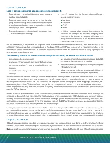 Loss of CoverageLoss of coverage qualifies as a special enrollment event if:%u2022 The employee or dependent(s) lost other group coverage due to a loss of eligibility.%u2022 The employee or dependent(s) elected to drop the other group health coverage because the employer stopped all employer contributions toward the premium (including any employer-paid COBRA premium).%u2022 The employee and/or dependent(s) exhausted their COBRA continuation coverage. %u2022 Loss of coverage from the following also qualifies as a special enrollment event:%u2022 Medicare%u2022 Medicaid%u2022 CHIP%u2022 HIPP%u2022 Individual coverage when outside the control of the individual. For example: the insurance company claims bankruptcy, the insurance company withdraws from doing business in the state or the insurance company cancels the block of business.For loss of Medicaid, CHIP, or HIPP the employee must notify the Benefits Administrator within 60 days from the date of the notification that coverage has terminated. Loss of Medicaid, CHIP, or HIPP due to incorrect or missing information is not considered a special enrollment event. To qualify for a special enrollment event, the loss must be due to losing eligibility for the coverage due to age, income, etc.The following reasons for loss of other coverage do not qualify as special enrollment events:%u2022 an increase in the premium cost%u2022 a reduction in the employer%u2019s contribution to the premium%u2022 voluntary termination of coverage, including failure to pay premium%u2022 any additional surcharge or benefit reduction for spouse coverage%u2022 any reduction of benefits such as an increase in deductible or change in the coordination of benefits%u2022 a doctor or other health care provider no longer participates in the plan%u2019s network%u2022 failure to act or respond to an employer%u2019s eligibility audit, which results in loss of coverage for dependentsVoluntary terminations of other coverage, such as dropping other coverage during a spouse%u2019s enrollment period or a Section 125 cafeteria plan enrollment period due to premium or benefit changes, including spousal surcharges or coverage restrictions, are not special enrollment events for TRS-ActiveCare. An employee cannot change plans when dropping a dependent, or a dependent aging-out, from TRS-ActiveCare coverage. An involuntary termination may occur when an employee is terminated or leaves employment resulting in an involuntary loss of eligibility. An involuntary loss of coverage is considered a special enrollment event for TRS-ActiveCare.In order to have a special enrollment event when the employee or dependent of an employee loses other health coverage, the employee or dependent must have had other health coverage when coverage under TRS-ActiveCare was previously declined in writing. If the other coverage was COBRA continuation coverage, special enrollment can be requested only after the COBRA continuation coverage is exhausted. If the other coverage was not COBRA continuation coverage, special enrollment can be requested when the individual loses eligibility for the other coverage.If an employee enrolls via the bswift Enrollment Portal or their Third-Party Enrollment Portal due to %u201closs of other coverage,%u201d the employee%u2019s original application must be checked to verify that coverage was declined (in section 6) due to other coverage. If a declination of coverage was not completed, proof of coverage loss in lieu of a declination must be provided by the employee for a special enrollment event. If documentation is not made available, the employee%u2019s request to add coverage will be denied.Dropping CoverageTRS-ActiveCare participants may drop coverage during a plan year, unless restricted from doing so by their employer%u2019s Internal Revenue Code Section 125 cafeteria plan. Please consult your cafeteria 125 plan administrator to determine if this is allowed.Note: An employee cannot change plans when dropping a dependent, or a dependent turning 26, from TRS-ActiveCare coverage.24 www.bcbstx.com/trsactivecareba