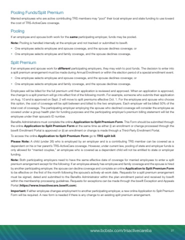 Pooling Funds/Split PremiumMarried employees who are active contributing TRS members may %u201cpool%u201d their local employer and state funding to use toward the cost of TRS-ActiveCare coverage.PoolingIf an employee and spouse both work for the same participating employer, funds may be pooled. Note: Pooling is handled internally at the employer and not tracked or submitted to bswift.%u2022 One employee selects employee and spouse coverage, and the spouse declines coverage; or%u2022 One employee selects employee and family coverage, and the spouse declines coverage.Split PremiumIf an employee and spouse work for different participating employers, they may wish to pool funds. The decision to enter into a split premium arrangement must be made during Annual Enrollment or within the election period of a special enrollment event.%u2022 One employee selects employee and spouse coverage, and the spouse declines coverage; or%u2022 One employee selects employee and family coverage, and the spouse declines coverage.Employees will be billed for the full premium until their application is reviewed and approved. When an application is approved, the change to a split premium will go into effect first of the following month. For example, someone who submits their application on Aug. 10 and is approved on Sept. 2 will move to split premiums effective Oct. 1. For the employee and spouse who choose this option, the cost of coverage will be split between and billed to the two employers. Each employer will be billed 50% of the total cost of coverage. The participating employer employing the spouse who declined coverage will consider the employee as covered under a group health plan for funding purposes and the participating employer%u2019s premium billing statement will list the employee under their spouse%u2019s ID number.Benefits Administrators must complete the online Application to Split Premium Form. This Form should be submitted through the online Application to Split Premium Form at the same time as either (i) an enrollment or change processed through the bswift Enrollment Portal is approved or (ii) an enrollment or change is made through a Third-Party Enrollment Portal.To access the online Application to Split Premium Form go to TRS split bill.Please Note: A child (under 26) who is employed by an employer and is a contributing TRS member can be covered as a dependent on his or her parent%u2019s TRS-ActiveCare coverage. However, under current law, pooling of state and employer funds is only allowed for %u201cmarried couples,%u201d an employee who is covered as a dependent child will not be entitled to state or employer funding.Note: Both participating employers need to have the same effective date of coverage for married employees to enter a split premium arrangement except for the following: If an employee already has employee and family coverage and the spouse is hired by another participating employer, the spouse can decline coverage and complete an online Application to Split Premium Formto be effective on the first of the month following the spouse%u2019s actively-at-work date. Requests for a split premium arrangement must be signed, dated and submitted to the Benefits Administrator within the plan enrollment period and received by bswift within the membership processing guidelines. Requests for exceptions can be made through the bswift Exception and Appeals Portal (https://www.trsactivecare.bswift.com).Important: If either employee changes employment to another participating employer, a new online Application to Split Premium Form will be required. A new form is needed if there is any change to an existing split premium arrangement.www.bcbstx.com/trsactivecareba 27