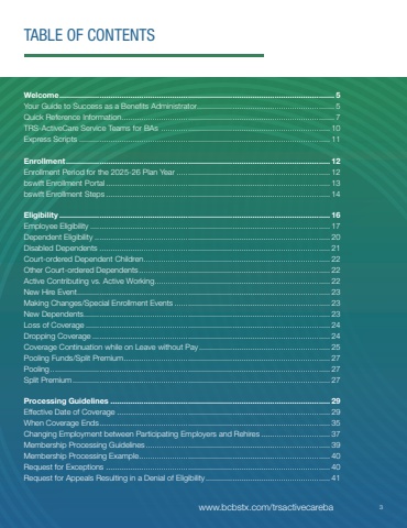 TABLE OF CONTENTSWelcome............................................................................................................................ 5Your Guide to Success as a Benefits Administrator.............................................................. 5Quick Reference Information................................................................................................ 7TRS-ActiveCare Service Teams for BAs ............................................................................ 10Express Scripts ................................................................................................................. 11Enrollment....................................................................................................................... 12Enrollment Period for the 2025-26 Plan Year ..................................................................... 12bswift Enrollment Portal ..................................................................................................... 13bswift Enrollment Steps ..................................................................................................... 14Eligibility .......................................................................................................................... 16Employee Eligibility ............................................................................................................ 17Dependent Eligibility .......................................................................................................... 20Disabled Dependents ........................................................................................................ 21Court-ordered Dependent Children.................................................................................... 22Other Court-ordered Dependents ...................................................................................... 22Active Contributing vs. Active Working............................................................................... 22New Hire Event.................................................................................................................. 23Making Changes/Special Enrollment Events ...................................................................... 23New Dependents............................................................................................................... 23Loss of Coverage .............................................................................................................. 24Dropping Coverage ........................................................................................................... 24Coverage Continuation while on Leave without Pay ........................................................... 25Pooling Funds/Split Premium............................................................................................. 27Pooling.............................................................................................................................. 27Split Premium.................................................................................................................... 27Processing Guidelines ................................................................................................... 29Effective Date of Coverage ................................................................................................ 29When Coverage Ends........................................................................................................ 35Changing Employment between Participating Employers and Rehires ............................... 37Membership Processing Guidelines ................................................................................... 39Membership Processing Example...................................................................................... 40Request for Exceptions ..................................................................................................... 40Request for Appeals Resulting in a Denial of Eligibility ........................................................ 41www.bcbstx.com/trsactivecareba 3