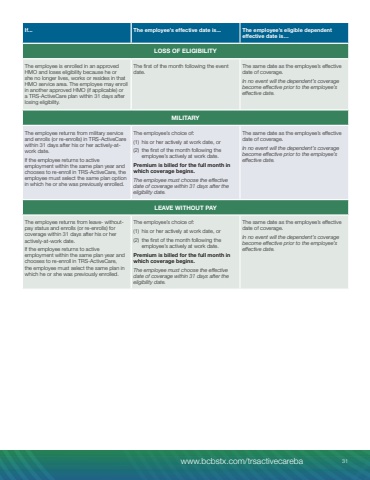 If... The employee%u2019s effective date is... The employee%u2019s eligible dependent effective date is%u2026LOSS OF ELIGIBILITYThe employee is enrolled in an approved HMO and loses eligibility because he or she no longer lives, works or resides in that HMO service area. The employee may enroll in another approved HMO (if applicable) or a TRS-ActiveCare plan within 31 days after losing eligibility.The first of the month following the event date.The same date as the employee%u2019s effective date of coverage.In no event will the dependent%u2019s coverage become effective prior to the employee%u2019s effective date.MILITARYThe employee returns from military service and enrolls (or re-enrolls) in TRS-ActiveCare within 31 days after his or her actively-atwork date.If the employee returns to active employment within the same plan year and chooses to re-enroll in TRS-ActiveCare, the employee must select the same plan option in which he or she was previously enrolled.The employee%u2019s choice of:(1) his or her actively at work date, or(2) the first of the month following the employee%u2019s actively at work date.Premium is billed for the full month in which coverage begins.The employee must choose the effective date of coverage within 31 days after the eligibility date.The same date as the employee%u2019s effective date of coverage.In no event will the dependent%u2019s coverage become effective prior to the employee%u2019s effective date.LEAVE WITHOUT PAYThe employee returns from leave- withoutpay status and enrolls (or re-enrolls) for coverage within 31 days after his or her actively-at-work date.If the employee returns to active employment within the same plan year and chooses to re-enroll in TRS-ActiveCare, the employee must select the same plan in which he or she was previously enrolled.The employee%u2019s choice of:(1) his or her actively at work date, or(2) the first of the month following the employee%u2019s actively at work date.Premium is billed for the full month in which coverage begins.The employee must choose the effective date of coverage within 31 days after the eligibility date.The same date as the employee%u2019s effective date of coverage.In no event will the dependent%u2019s coverage become effective prior to the employee%u2019s effective date.www.bcbstx.com/trsactivecareba 31