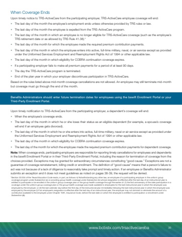When Coverage EndsUpon timely notice to TRS-ActiveCare from the participating employer, TRS-ActiveCare employee coverage will end:%u2022 The last day of the month the employee%u2019s employment ends unless otherwise provided by TRS rules or law.%u2022 The last day of the month the employee is expelled from the TRS-ActiveCare program.%u2022 The last day of the month in which an employee is no longer eligible for TRS-ActiveCare coverage (such as the employee%u2019s TRS retirement date or as allowed by TRS Rule 41.38).*%u2022 The last day of the month for which the employee made the required premium contribution payments.%u2022 The last day of the month in which the employee enters into active, full-time military, naval, or air service except as provided under the Uniformed Services Employment and Reemployment Rights Act of 1994 or other applicable law.%u2022 The last day of the month in which eligibility for COBRA continuation coverage expires.%u2022 If a participating employer fails to make all premium payments for a period of at least 90 days.%u2022 The day the TRS-ActiveCare program is terminated.%u2022 End of the plan year in which your employer discontinues participation in TRS-ActiveCare.Based on the rules listed above mid-month coverage cancellations are not allowed. An employee may still terminate mid-month but coverage must go through the end of the month.Benefits Administrators should enter future termination dates for employees using the bswift Enrollment Portal or your Third-Party Enrollment Portal.Upon timely notification to TRS-ActiveCare from the participating employer, a dependent%u2019s coverage will end:%u2022 When the employee%u2019s coverage ends.%u2022 The last day of the month in which he or she loses their status as an eligible dependent (for example, a spouse%u2019s coverage will end if an employee gets divorced).%u2022 The last day of the month in which he or she enters into active, full-time military, naval or air service except as provided under the Uniformed Services Employment and Reemployment Rights Act of 1994 or other applicable law.%u2022 The last day of the month in which eligibility for COBRA continuation coverage expires.%u2022 The last day of the month for which the employee made the required premium contribution payments for dependent coverage.Note: When coverage ends, participating employers are responsible for reporting timely cancellations for employees and dependents in the bswift Enrollment Portal or in their Third-Party Enrollment Portal, including the reason for termination of coverage from the choices provided. Exceptions may be granted for extraordinary circumstances constituting %u201cgood cause.%u201d Exceptions are not a guarantee of coverage reinstatement, billing credit or enrollment. The definition of %u201cgood cause%u201d means that a person%u2019s failure to act was not because of a lack of diligence to reasonably take prompt and timely action. If an employee or Benefits Administrator submits an exception and it does not meet guidelines as noted on pages 38-39, the request will be denied.*Section 22.004 of the Texas Education Code reads, in part, as follows: k) Notwithstanding any other law, an employee of a participating employer in the uniform group coverage program under Subsection (a) or providing group health coverage under Subsection (b) whose resignation is effective after the last day of an instructional year is entitled to participate or be enrolled in the uniform group coverage plan or the group health coverage through the earlier of: (1) the first anniversary of the date participation in a coverage under the uniform group coverage plan or the group health coverage was made available to employees for the last instructional year in which the employee was employed by the employer; or (2) the last calendar day before the first day of the instructional year immediately following the last instructional year in which the employee was employed by the employer (l) If an employee%u2019s resignation is effective after the last day of an instructional year, the employer may not diminish or eliminate the amount of a contribution available to the employee under Chapter 1581, Insurance Code, before the last date on which the employee is entitled to participation or enrollment under Subsection (k).www.bcbstx.com/trsactivecareba 35