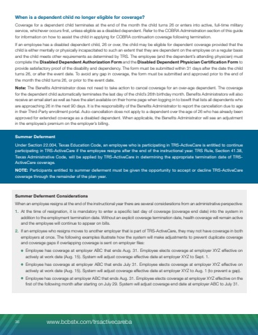 When is a dependent child no longer eligible for coverage?Coverage for a dependent child terminates at the end of the month the child turns 26 or enters into active, full-time military service, whichever occurs first, unless eligible as a disabled dependent. Refer to the COBRA Administration section of this guide for information on how to assist the child in applying for COBRA continuation coverage following termination.If an employee has a disabled dependent child, 26 or over, the child may be eligible for dependent coverage provided that the child is either mentally or physically incapacitated to such an extent that they are dependent on the employee on a regular basis and the child meets other requirements as determined by TRS. The employee (and the dependent%u2019s attending physician) must complete the Disabled Dependent Authorization Form and the Disabled Dependent Physician Certification Form to provide satisfactory proof of the disability and dependency. The form must be submitted within 31 days after the date the child turns 26, or after the event date. To avoid any gap in coverage, the form must be submitted and approved prior to the end of the month the child turns 26, or prior to the event date.Note: The Benefits Administrator does not need to take action to cancel coverage for an over-age dependent. The coverage for the dependent child automatically terminates the last day of the child%u2019s 26th birthday month. Benefits Administrators will also receive an email alert as well as have the alert available on their home page when logging in to bswift that lists all dependents who are approaching 26 in the next 90 days. It is the responsibility of the Benefits Administrator to report the cancellation due to age in their Third-Party enrollment portal. Auto-cancellation does not apply to a dependent over the age of 26 who has already been approved for extended coverage as a disabled dependent. When applicable, the Benefits Administrator will see an adjustment in the employee%u2019s premium on the employer%u2019s billing.Summer DefermentUnder Section 22.004, Texas Education Code, an employee who is participating in TRS-ActiveCare is entitled to continue participating in TRS-ActiveCare if the employee resigns after the end of the instructional year. TRS Rule, Section 41.38, Texas Administrative Code, will be applied by TRS-ActiveCare in determining the appropriate termination date of TRSActiveCare coverage.NOTE: Participants entitled to summer deferment must be given the opportunity to accept or decline TRS-ActiveCare coverage through the remainder of the plan year.Summer Deferment ConsiderationsWhen an employee resigns at the end of the instructional year there are several considerations from an administrative perspective:1. At the time of resignation, it is mandatory to enter a specific last day of coverage (coverage end date) into the system in addition to the employment termination date. Without an explicit coverage termination date, health coverage will remain active and the employee will continue to appear on bills.2. If an employee who resigns moves to another employer that is part of TRS-ActiveCare, they may not have coverage in both employers at once. The following examples illustrate how the system will make adjustments to prevent duplicate coverage and coverage gaps if overlapping coverage is sent on employer files:%u2022 Employee has coverage at employer ABC that ends Aug. 31. Employee elects coverage at employer XYZ effective on actively at work date (Aug. 15). System will adjust coverage effective date at employer XYZ to Sept. 1.%u2022 Employee has coverage at employer ABC that ends July 31. Employee elects coverage at employer XYZ effective on actively at work date (Aug. 15). System will adjust coverage effective date at employer XYZ to Aug. 1 (to prevent a gap).%u2022 Employee has coverage at employer ABC that ends Aug. 31. Employee elects coverage at employer XYZ effective on the first of the following month after starting on July 29. System will adjust coverage end date at employer ABC to July 31.36 www.bcbstx.com/trsactivecareba