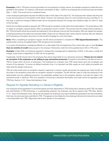 Examples: A BA or TPA does not send termination for an employee in a timely manner. An exception request for credit will not be granted for this scenario. For instance, a BA sends a termination on May 1, 2026 for an employee who should have been terminated Sept. 1, 2025. This would not be considered timely.A new employee (participant) requests the effective date of their date of hire (April 22). The employee then realizes that they had to pay the full premium for the partial month (April). However, the employee does not communicate the issue until May 27. In this case, a credit and change of effective date will not be granted because the change was needed by May 23, within 31 days of the hire date.bswift will coordinate exception requests with TRS through its exception portal within the bswift platform. The portal allows a BA to create an exception request directly within an employee%u2019s record in bswift. This ensures that all correspondence between a BA, TRS and bswift will be documented and attached to the employee%u2018s record with the exception. BAs can explain the request, including all pertinent information and important dates. Fields such as %u201cRequest Type%u201d will be used for tracking. BAs can reference the Processing an Exception document on their bswift homepage for more information.Note: When completing an exception request, the BA will be prompted to complete the TRS Appeal/Questionnaire. This questionnaire must be completed before TRS will approve the exception.In no event will retroactive coverage be effective on a date earlier than the beginning of the current plan year or result in more than six months of credit being issued to the employer. Retroactive credit will not be granted due to BA or TPA errors.Example: In May 2026, an employee requests to change their coverage back to September of 2025. In this case, a credit and change of plan back to September of 2025 will not be granted.If applicable, the BA should inform the employee they will be responsible for any retroactive premiums. Please do not submit an exception if the employee is not willing to pay retroactive premiums. Exceptions submitted by the BAs are sent to TRS for review within 48 hours of submission. The timeframe for a decision from TRS varies based upon the complexity and volume of the requests. To ensure an efficient resolution time, it is important that BAs supply as much detail as possible and state what the desired outcome is.TRS will notify bswift when an exception request is approved or denied. bswift will process the request and notify the BA via the ticket in the exception portal when an exception request is completed. The BA will then need to notify the employee of the determination and any additional premiums. Any applicable updates due to the exception decision must also be made in the enrollment portal. A denial by TRS of an exception concerning a retroactive termination and credit cannot be appealed under TRS Rule, Section 41.51, Texas Administrative Code.Request for Appeals Resulting in a Denial of EligibilityIf an employee whose application to enroll themselves and their dependents in TRS-ActiveCare is denied by either TRS, the health plan administrator of TRS-ActiveCare, or a participating employer, the employee may file an appeal under TRS Rule, Section 41.51, Texas Administrative Code. Along with this appeal, the employee may submit additional explanations and documentation that have not previously been submitted to TRS. The appeal can be initiated by the employee following the instructions provided in the denial letter from TRS. Responses will be sent directly to the employee.www.bcbstx.com/trsactivecareba 41