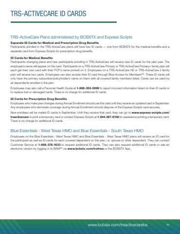 TRS-ActiveCare Plans administered by BCBSTX and Express ScriptsSeparate ID Cards for Medical and Prescription Drug BenefitsParticipants enrolled in the TRS-ActiveCare plans will have two ID cards %u2014 one from BCBSTX for the medical benefits and a separate card from Express Scripts for prescription drug benefits.ID Cards for Medical BenefitsParticipants changing plans and new participants enrolling in TRS-ActiveCare will receive new ID cards for the plan year. The employee%u2019s name will appear on the card. Participants on a TRS-ActiveCare Primary or TRS-ActiveCare Primary+ family plan will each get their own card with their PCP%u2019s name printed on it. Employees on a TRS-ActiveCare HD or TRS-ActiveCare 2 family plan will receive two cards. Employees can also access their ID card through Blue Access for MembersSM. These ID cards will only have the primary subscriber/policyholder%u2019s name on them with all covered family members listed. Cards can be used by all dependents enrolled in the plan.Employees may also call a Personal Health Guide at 1-866-355-5999 to report incorrect information listed on their ID cards or to replace lost or damaged cards. There is no charge for additional ID cards. ID Cards for Prescription Drug BenefitsEmployees who make plan changes during Annual Enrollment should use this card until they receive an updated card in September. Any employees who terminate coverage during Annual Enrollment should dispose of the Express Scripts card securely.New enrollees will be mailed ID cards in September. Until they receive that card, they can go to www.express-scripts.com/trsactivecare to print a temporary card or contact Express Scripts at 1-844-367-6108 for assistance printing a temporary card. There is no charge for additional ID cards.Blue Essentials - West Texas HMO and Blue Essentials - South Texas HMOEmployees on the Blue Essentials - West Texas HMO and Blue Essentials - West Texas HMO plans will receive an ID card for the participant as well as ID cards for each covered dependent on the plan, i.e. spouse or other dependent. They can contact Customer Service at 1-888-378-1633 to request additional ID cards. They can also request additional ID cards or see an electronic version by logging in to BAMSM via www.bcbstx.com/trshmo or the BCBSTX App.TRS-ACTIVECARE ID CARDSwww.bcbstx.com/trsactivecareba 45