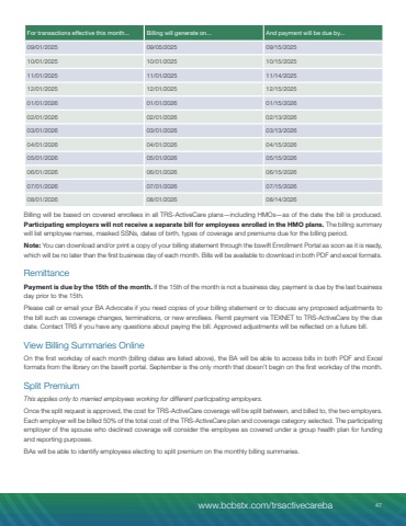 For transactions effective this month... Billing will generate on... And payment will be due by...09/01/2025 09/05/2025 09/15/202510/01/2025 10/01/2025 10/15/202511/01/2025 11/01/2025 11/14/202512/01/2025 12/01/2025 12/15/202501/01/2026 01/01/2026 01/15/202602/01/2026 02/01/2026 02/13/202603/01/2026 03/01/2026 03/13/202604/01/2026 04/01/2026 04/15/202605/01/2026 05/01/2026 05/15/202606/01/2026 06/01/2026 06/15/202607/01/2026 07/01/2026 07/15/202608/01/2026 08/01/2026 08/14/2026Billing will be based on covered enrollees in all TRS-ActiveCare plans%u2014including HMOs%u2014as of the date the bill is produced. Participating employers will not receive a separate bill for employees enrolled in the HMO plans. The billing summary will list employee names, masked SSNs, dates of birth, types of coverage and premiums due for the billing period.Note: You can download and/or print a copy of your billing statement through the bswift Enrollment Portal as soon as it is ready, which will be no later than the first business day of each month. Bills will be available to download in both PDF and excel formats.RemittancePayment is due by the 15th of the month. If the 15th of the month is not a business day, payment is due by the last business day prior to the 15th.Please call or email your BA Advocate if you need copies of your billing statement or to discuss any proposed adjustments to the bill such as coverage changes, terminations, or new enrollees. Remit payment via TEXNET to TRS-ActiveCare by the due date. Contact TRS if you have any questions about paying the bill. Approved adjustments will be reflected on a future bill.View Billing Summaries OnlineOn the first workday of each month (billing dates are listed above), the BA will be able to access bills in both PDF and Excel formats from the library on the bswift portal. September is the only month that doesn%u2019t begin on the first workday of the month.Split PremiumThis applies only to married employees working for different participating employers.Once the split request is approved, the cost for TRS-ActiveCare coverage will be split between, and billed to, the two employers. Each employer will be billed 50% of the total cost of the TRS-ActiveCare plan and coverage category selected. The participating employer of the spouse who declined coverage will consider the employee as covered under a group health plan for funding and reporting purposes.BAs will be able to identify employees electing to split premium on the monthly billing summaries. www.bcbstx.com/trsactivecareba 47