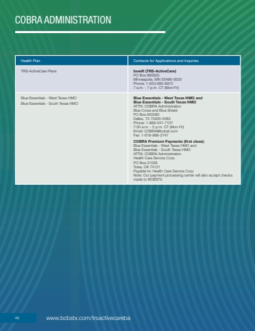 COBRA ADMINISTRATIONHealth Plan Contacts for Applications and InquiriesTRS-ActiveCare Plans bswift (TRS-ActiveCare)PO Box 860620Minneapolis, MN 55486-0620Phone: 1-833-682-89727 a.m. - 7 p.m. CT (Mon-Fri)Blue Essentials - West Texas HMO Blue Essentials - South Texas HMOBlue Essentials - West Texas HMO and Blue Essentials - South Texas HMOATTN: COBRA AdministrationBlue Cross and Blue ShieldPO Box 655082Dallas, TX 75265-5082Phone: 1-888-541-71077:30 a.m. - 5 p.m. CT (Mon-Fri)Email: COBRA@bcbsil.comFax: 1-618-998-2747COBRA Premium Payments (first class):Blue Essentials - West Texas HMO and Blue Essentials - South Texas HMOATTN: COBRA AdministrationHealth Care Service Corp.PO Box 21026Tulsa, OK 74121Payable to: Health Care Service CorpNote: Our payment processing center will also accept checks made to BCBSTX.48 www.bcbstx.com/trsactivecareba