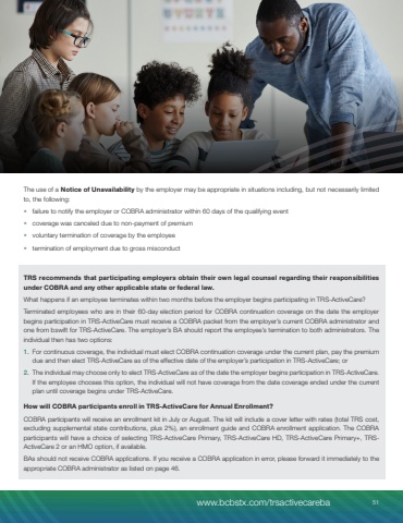 The use of a Notice of Unavailability by the employer may be appropriate in situations including, but not necessarily limited to, the following:%u2022 failure to notify the employer or COBRA administrator within 60 days of the qualifying event%u2022 coverage was canceled due to non-payment of premium%u2022 voluntary termination of coverage by the employee%u2022 termination of employment due to gross misconductTRS recommends that participating employers obtain their own legal counsel regarding their responsibilities under COBRA and any other applicable state or federal law.What happens if an employee terminates within two months before the employer begins participating in TRS-ActiveCare?Terminated employees who are in their 60-day election period for COBRA continuation coverage on the date the employer begins participation in TRS-ActiveCare must receive a COBRA packet from the employer%u2019s current COBRA administrator and one from bswift for TRS-ActiveCare. The employer%u2019s BA should report the employee%u2019s termination to both administrators. The individual then has two options:1. For continuous coverage, the individual must elect COBRA continuation coverage under the current plan, pay the premium due and then elect TRS-ActiveCare as of the effective date of the employer%u2019s participation in TRS-ActiveCare; or2. The individual may choose only to elect TRS-ActiveCare as of the date the employer begins participation in TRS-ActiveCare. If the employee chooses this option, the individual will not have coverage from the date coverage ended under the current plan until coverage begins under TRS-ActiveCare.How will COBRA participants enroll in TRS-ActiveCare for Annual Enrollment?COBRA participants will receive an enrollment kit in July or August. The kit will include a cover letter with rates (total TRS cost, excluding supplemental state contributions, plus 2%), an enrollment guide and COBRA enrollment application. The COBRA participants will have a choice of selecting TRS-ActiveCare Primary, TRS-ActiveCare HD, TRS-ActiveCare Primary+, TRSActiveCare 2 or an HMO option, if available.BAs should not receive COBRA applications. If you receive a COBRA application in error, please forward it immediately to the appropriate COBRA administrator as listed on page 46.www.bcbstx.com/trsactivecareba 51
