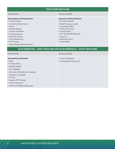 TRS-ACTIVECARE PLANSHealth Benefits Pharmacy Benefitswww.bcbstx.com/trsactivecare%u2022 Provider Finder%u00ae%u2022 Annual Enrollment Guide%u2022 Forms%u2022 Benefits Booklet%u2022 Contact Information%u2022 ID Cards Request%u2022 View Claim History%u2022 Cost Estimator tool%u2022 PCP Change%u2022 Well onTarget Wellness Programwww.esrx.com/trsactivecare%u2022 Pharmacy Benefits%u2022 Retail Pharmacy Locator%u2022 Drug Name Search%u2022 Preferred Drug List%u2022 Access Claims%u2022 Plan Year Benefits Balances%u2022 Drug List%u2022 Mail-Order Forms%u2022 Online RefillsBLUE ESSENTIALS - WEST TEXAS HMO AND BLUE ESSENTIALS - SOUTH TEXAS HMOHealth Benefits Pharmacy Benefitswww.bcbstx.com/trshmo%u2022 BAM %u2022 Provider Finder%u2022 Benefits Booklet%u2022 Plan Highlights%u2022 Summary of Benefits and Coverage%u2022 Evidence of Coverage %u2022 ID Card%u2022 Request PCP Change%u2022 Claims Information%u2022 Health and Wellbeing Resources%u2022 Prime Therapeutics%u2022 Participating Pharmacy List54 www.bcbstx.com/trsactivecareba