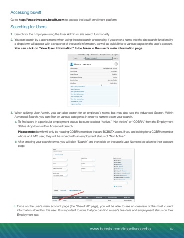 Accessing bswiftGo to http://trsactivecare.bswift.com to access the bswift enrollment platform.Searching for Users1. Search for the Employee using the User Admin or site search functionality.2. You can search by a user%u2019s name when using the site search functionality. If you enter a name into the site search functionality, a dropdown will appear with a snapshot of the user%u2019s information, as well as quick links to various pages on the user%u2019s account. You can click on %u201cView User Information%u201d to be taken to the user%u2019s main information page.3. When utilizing User Admin, you can also search for an employee%u2019s name, but may also use the Advanced Search. Within Advanced Search, you can filter on various categories in order to narrow down your search.a. To find users in a particular employment status, be sure to select %u201cActive,%u201d %u201cNot Active%u201d or %u201cCOBRA%u201d from the Employment Status dropdown within Advanced Search. Please note: bswift will only be housing COBRA members that are BCBSTX users. If you are looking for a COBRA member who is an HMO user, they will be stored with an employment status of %u201cNot Active.%u201db. After entering your search terms, you will click %u201cSearch%u201d and then click on the user%u2019s Last Name to be taken to their account page.c. Once on the user%u2019s main account page (the %u201cView/Edit%u201d page), you will be able to see an overview of the most current information stored for this user. It is important to note that you can find a user%u2019s hire date and employment status on their Employment tab.www.bcbstx.com/trsactivecareba 59