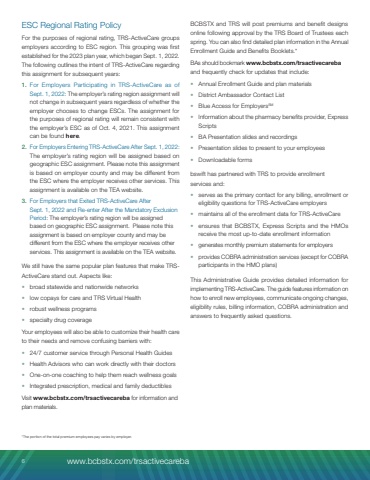 ESC Regional Rating PolicyFor the purposes of regional rating, TRS-ActiveCare groups employers according to ESC region. This grouping was first established for the 2023 plan year, which began Sept. 1, 2022. The following outlines the intent of TRS-ActiveCare regarding this assignment for subsequent years:1. For Employers Participating in TRS-ActiveCare as of Sept. 1, 2022: The employer%u2019s rating region assignment will not change in subsequent years regardless of whether the employer chooses to change ESCs. The assignment for the purposes of regional rating will remain consistent with the employer%u2019s ESC as of Oct. 4, 2021. This assignment can be found here.2. For Employers Entering TRS-ActiveCare After Sept. 1, 2022: The employer%u2019s rating region will be assigned based on geographic ESC assignment. Please note this assignment is based on employer county and may be different from the ESC where the employer receives other services. This assignment is available on the TEA website.3. For Employers that Exited TRS-ActiveCare After Sept. 1, 2022 and Re-enter After the Mandatory Exclusion Period: The employer%u2019s rating region will be assigned based on geographic ESC assignment. Please note this assignment is based on employer county and may be different from the ESC where the employer receives other services. This assignment is available on the TEA website.We still have the same popular plan features that make TRSActiveCare stand out. Aspects like: %u2022 broad statewide and nationwide networks%u2022 low copays for care and TRS Virtual Health %u2022 robust wellness programs%u2022 specialty drug coverage Your employees will also be able to customize their health care to their needs and remove confusing barriers with:%u2022 24/7 customer service through Personal Health Guides %u2022 Health Advisors who can work directly with their doctors %u2022 One-on-one coaching to help them reach wellness goals %u2022 Integrated prescription, medical and family deductibles Visit www.bcbstx.com/trsactivecareba for information and plan materials.BCBSTX and TRS will post premiums and benefit designs online following approval by the TRS Board of Trustees each spring. You can also find detailed plan information in the Annual Enrollment Guide and Benefits Booklets.*BAs should bookmark www.bcbstx.com/trsactivecareba and frequently check for updates that include:%u2022 Annual Enrollment Guide and plan materials%u2022 District Ambassador Contact List%u2022 Blue Access for EmployersSM%u2022 Information about the pharmacy benefits provider, Express Scripts%u2022 BA Presentation slides and recordings%u2022 Presentation slides to present to your employees%u2022 Downloadable formsbswift has partnered with TRS to provide enrollment services and:%u2022 serves as the primary contact for any billing, enrollment or eligibility questions for TRS-ActiveCare employers%u2022 maintains all of the enrollment data for TRS-ActiveCare%u2022 ensures that BCBSTX, Express Scripts and the HMOs receive the most up-to-date enrollment information%u2022 generates monthly premium statements for employers%u2022 provides COBRA administration services (except for COBRA participants in the HMO plans)This Administrative Guide provides detailed information for implementing TRS-ActiveCare. The guide features information on how to enroll new employees, communicate ongoing changes, eligibility rules, billing information, COBRA administration and answers to frequently asked questions.*The portion of the total premium employees pay varies by employer.6 www.bcbstx.com/trsactivecareba