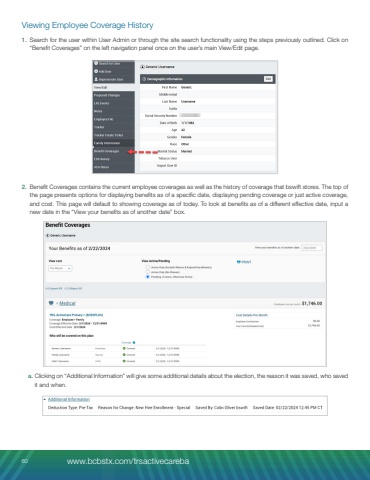 Viewing Employee Coverage History1. Search for the user within User Admin or through the site search functionality using the steps previously outlined. Click on %u201cBenefit Coverages%u201d on the left navigation panel once on the user%u2019s main View/Edit page.2. Benefit Coverages contains the current employee coverages as well as the history of coverage that bswift stores. The top of the page presents options for displaying benefits as of a specific date, displaying pending coverage or just active coverage, and cost. This page will default to showing coverage as of today. To look at benefits as of a different effective date, input a new date in the %u201cView your benefits as of another date%u201d box.a. Clicking on %u201cAdditional Information%u201d will give some additional details about the election, the reason it was saved, who saved it and when.60 www.bcbstx.com/trsactivecareba