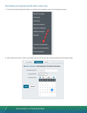 Terminating an employee (bswift direct users only)1. Use the Terminate Employment button on the left-hand navigation panel of the employee%u2019s record.2. After clicking this button, enter a termination reason and the last day worked (employment termination date).66 www.bcbstx.com/trsactivecareba