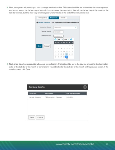 3. Next, the system will prompt you for a coverage termination date. This date should be set to the date that coverage ends and should always be the last day of a month. In most cases, the termination date will be the last day of the month of the last day worked, but that may vary for employees who terminate at the end of the instructional year.4. Next, a last day of coverage date will pop up for verification. That date will be set to the day you entered for the termination date, or the last day of the month of termination if you did not enter the last day of the month on the previous screen. If the date is correct, click Save.www.bcbstx.com/trsactivecareba 67