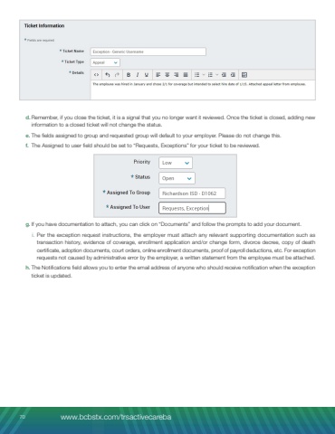d. Remember, if you close the ticket, it is a signal that you no longer want it reviewed. Once the ticket is closed, adding new information to a closed ticket will not change the status.e. The fields assigned to group and requested group will default to your employer. Please do not change this.f. The Assigned to user field should be set to %u201cRequests, Exceptions%u201d for your ticket to be reviewed.g. If you have documentation to attach, you can click on %u201cDocuments%u201d and follow the prompts to add your document.i. Per the exception request instructions, the employer must attach any relevant supporting documentation such as transaction history, evidence of coverage, enrollment application and/or change form, divorce decree, copy of death certificate, adoption documents, court orders, online enrollment documents, proof of payroll deductions, etc. For exception requests not caused by administrative error by the employer, a written statement from the employee must be attached.h. The Notifications field allows you to enter the email address of anyone who should receive notification when the exception ticket is updated.70 www.bcbstx.com/trsactivecareba