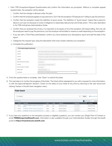 i. Click TRS Exceptions/Appeal Questionnaire and confirm the information as prompted. Without a complete appeal questionnaire, the exception will be denied.i. Confirm that the change is allowed under the plan.ii. Confirm that the employee agrees to pay premiums. Don%u2019t file the exception if Employee isn%u2019t willing to pay the premium.iii. Confirm that the exception meets the definition of good cause. The definition of %u201cgood cause%u201d means that a person%u2019s failure to act was not because of a lack of diligence to reasonably take prompt and timely action. This is also described in the TRS-ActiveCare Administrative Guide.iv. Confirm that you reviewed the invoice. It is important to be aware of how this exception will impact billing. Not only will the employee need to pay the premiums, but the employer will be billed or receive a credit depending on the exception.v. If you are with a Third-Party administrator, confirm you have reviewed your discrepancy report and add the date of the report.vi. Categorize the request type using the description that most closely matches your exception.vii. Complete the justification.5. Once the questionnaire is complete, click %u201cSave%u201d to submit the ticket.6. The next step is to monitor the progress of the ticket. The ticket will be reassigned to you with a request for more information, or with the approval/rejection decision. Check on the status of your ticket at any time by returning to the user record and clicking Tracker in the left-hand navigation menu.7. If you have any questions on the exception process or eligibility questions, you can contact your Single Point of Contact or email TRSBAinquiries@bswift.com. Information is also available through your Administrative Guides through the bswift portal at https://trsactivecare.bswift.com.www.bcbstx.com/trsactivecareba 71
