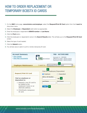 1. On the BAE home page, www.bcbstx.com/employer, select the Request/Print ID Card option from the I want todrop-down menu.2. Select the Employee or Dependent radio button as appropriate.3. Enter the employee or dependent%u2019s SSN/ID number or Last Name.4. Click the Find button.5. Click the employee%u2019s or dependent%u2019s name in the Search Results table. This will take you to the Request/Print ID Cardscreen.6. Select the type of card needed.7. Click the Submit button.8. You will also see an option to print or email a temporary ID card.HOW TO ORDER REPLACEMENT OR TEMPORARY BCBSTX ID CARDS123472 www.bcbstx.com/trsactivecareba