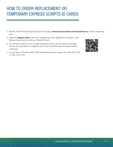 1. Visit the TRS-ActiveCare Express Scripts home page, www.expressscripts.com/trsactivecare, to print a temporary card.2. Select the Register Now button and complete the online registration for access to your Express Scripts account and your member ID card. 3. You will see an option to print or email a temporary ID card at the bottom of the page. You can also download your digital ID card to your phone through the Express Scripts mobile app.4. You can also call Express Scripts TRS-ActiveCare Customer Support at 1-844-367-6108 to order a new card.HOW TO ORDER REPLACEMENT OR TEMPORARY EXPRESS SCRIPTS ID CARDSwww.bcbstx.com/trsactivecareba 73