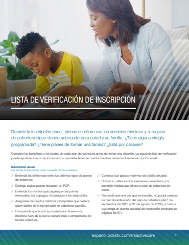 Durante la inscripci%u00f3n anual, piense en c%u00f3mo usa los servicios m%u00e9dicos y si su plan de cobertura sigue siendo adecuado para usted y su familia. %u00bfTiene alguna cirug%u00eda programada? %u00bfTiene planes de formar una familia? %u00bfEst%u00e1 por casarse?Compare los beneficios y los costos de cada plan de cobertura antes de tomar una decisi%u00f3n. La siguiente lista de verificaci%u00f3n puede ayudarle a recordar los aspectos que debe tener en cuenta mientras revisa la Gu%u00eda de inscripci%u00f3n anual.Inscripci%u00f3n anualLas fechas de inscripci%u00f3n var%u00edan. Consulte con su empleador.%u2713 Entienda las diferencias entre los distintos tipos de planes de cobertura.%u2713 Distinga cu%u00e1les planes requieren un PCP.%u2713 Entienda los montos que pagar%u00e1 por las primas mensuales, los copagos, el coseguro y los deducibles.%u2713 Aseg%u00farese de que los m%u00e9dicos y hospitales que prefiere est%u00e9n dentro de la red del plan de cobertura que elija.%u2713 Comprenda que acudir a proveedores de servicios m%u00e9dicos fuera de la red le costar%u00e1 m%u00e1s o simplemente no tendr%u00e1 cobertura.%u2713 Conozca sus gastos m%u00e1ximos de bolsillo anuales.%u2713 Conozca cu%u00e1les son los ex%u00e1menes preventivos y la atenci%u00f3n m%u00e9dica que ofrece el plan de cobertura sin costo.%u2713 Recuerde que una vez que se inscriba, no podr%u00e1 cambiar de plan durante el a%u00f1o del plan de cobertura (del 1 de septiembre de 2025 al 31 de agosto de 2026), a menos que tenga un evento especial de inscripci%u00f3n (consulte las p%u00e1ginas 56-57).LISTA DE VERIFICACI%u00d3N DE INSCRIPCI%u00d3Nespanol.bcbstx.com/trsactivecare 11