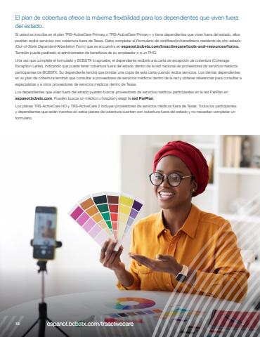 El plan de cobertura ofrece la m%u00e1xima flexibilidad para los dependientes que viven fuera del estado.Si usted se inscribe en el plan TRS%u2011ActiveCare Primary o TRS%u2011ActiveCare Primary+ y tiene dependientes que viven fuera del estado, ellos podr%u00edan recibir servicios con cobertura fuera de Texas. Debe completar el Formulario de certificaci%u00f3n/beneficiario residente de otro estado (Out-of-State Dependent/Attestation Form) que se encuentra en espanol.bcbstx.com/trsactivecare/tools-and-resources/forms.Tambi%u00e9n puede ped%u00edrselo al administrador de beneficios de su empleador o a un PHG.Una vez que complete el formulario y BCBSTX lo apruebe, el dependiente recibir%u00e1 una carta de excepci%u00f3n de cobertura (Coverage Exception Letter), indicando que puede tener cobertura fuera del estado dentro de la red nacional de proveedores de servicios m%u00e9dicos participantes de BCBSTX. Su dependiente tendr%u00e1 que brindar una copia de esta carta cuando reciba servicios. Los dem%u00e1s dependientes en su plan de cobertura tendr%u00e1n que consultar a proveedores de servicios m%u00e9dicos dentro de la red y obtener referencias para consultar a especialistas y a otros proveedores de servicios m%u00e9dicos dentro de Texas.Los dependientes que vivan fuera del estado pueden buscar proveedores de servicios m%u00e9dicos participantes en la red ParPlan en espanol.bcbstx.com. Pueden buscar un m%u00e9dico u hospital y elegir la red ParPlan.Los planes TRS%u2011ActiveCare HD y TRS%u2011ActiveCare 2 incluyen proveedores de servicios m%u00e9dicos fuera de Texas. Todos los participantes y dependientes que est%u00e1n inscritos en estos planes de cobertura cuentan con cobertura fuera del estado y no necesitan completar un formulario.18 espanol.bcbstx.com/trsactivecare espanol.bcbstx.com/trsactivecare
