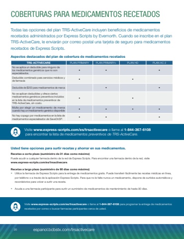 Usted tiene opciones para surtir recetas y ahorrar en sus medicamentos.Recetas a corto plazo (suministro de 31 d%u00edas como m%u00e1ximo)Puede acudir a cualquier farmacia dentro de la red de Express Scripts. Para encontrar una farmacia dentro de la red, visite www.express-scripts.com/es/trsactivecare.Recetas a largo plazo (suministro de 90 d%u00edas como m%u00e1ximo)%u2022 Utilice la farmacia de Express Scripts para la entrega de medicamentos gratis. Puede transferir f%u00e1cilmente las recetas m%u00e9dicas en l%u00ednea, por tel%u00e9fono o a trav%u00e9s de la aplicaci%u00f3n Express Scripts. Para que no le falte nunca un medicamento, dispone de surtidos autom%u00e1ticos y recordatorios para volver a surtir una receta.%u2022 Acuda a una farmacia participante para surtir un suministro de medicamentos de mantenimiento de hasta 90 d%u00edas.Visite www.express-scripts.com/es/trsactivecare o llame al 1%u2011844%u2011367%u20116108 para encontrar la lista de medicamentos preventivos de TRS-ActiveCare.Todas las opciones del plan TRS%u2011ActiveCare incluyen beneficios de medicamentos recetados administrados por Express Scripts by Evernorth. Cuando se inscribe en el plan TRS%u2011ActiveCare, le enviar%u00e1n por correo postal una tarjeta de seguro para medicamentos recetados de Express Scripts.Aspectos destacados del plan de cobertura de medicamentos recetadosTRS-ACTIVECARE PLAN PRIMARY PLAN PRIMARY+ PLAN HD PLAN AC 2No se aplica un deducible para ninguno de los medicamentos gen%u00e9ricos que no son especializados.%u2022 %u2022 %u2022Deducible combinado para servicios m%u00e9dicos y de farmacia %u2022 %u2022Deducible de $200 para medicamentos de marca %u2022 %u2022No se aplican deducibles y ofrece ciertos medicamentos gen%u00e9ricos preventivos incluidos en la lista de medicamentos preventivos de TRS-ActiveCare, sin costo.%u2022 %u2022Multa por elegir un medicamento de marca cuando hay un medicamento gen%u00e9rico disponible %u2022 %u2022 %u2022 %u2022No hay copago por medicamentos en la lista de medicamentos especializados de SaveOnSP. %u2022 %u2022 %u2022COBERTURAS PARA MEDICAMENTOS RECETADOSVisite www.express-scripts.com/es/trsactivecare o llame al 1%u2011844%u2011367%u20116108 para programar la entrega de medicamentos recetados por correo o buscar farmacias participantes cerca de usted.20 espanol.bcbstx.com/trsactivecare