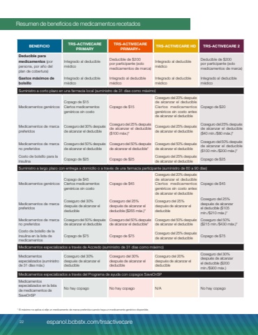 BENEFICIO TRS-ACTIVECARE PRIMARYTRS-ACTIVECARE PRIMARY+ TRS-ACTIVECARE HD TRS-ACTIVECARE 2Deducible para medicamentos (por persona, por a%u00f1o del plan de cobertura)Integrado al deducible m%u00e9dicoDeducible de $200 por participante (solo medicamentos de marca)Integrado al deducible m%u00e9dicoDeducible de $200 por participante (solo medicamentos de marca)Gastos m%u00e1ximos de bolsilloIntegrado al deducible m%u00e9dicoIntegrado al deducible m%u00e9dicoIntegrado al deducible m%u00e9dicoIntegrado al deducible m%u00e9dicoSuministro a corto plazo en una farmacia local (suministro de 31 d%u00edas como m%u00e1ximo)Medicamentos gen%u00e9ricosCopago de $15 Ciertos medicamentos gen%u00e9ricos sin costoCopago de $15Coseguro del 20% despu%u00e9s de alcanzar el deducible Ciertos medicamentos gen%u00e9ricos sin costo antes de alcanzar el deducibleCopago de $20Medicamentos de marca preferidosCoseguro del 30% despu%u00e9s de alcanzar el deducibleCoseguro del 25% despu%u00e9s de alcanzar el deducible ($100 m%u00e1x.)*Coseguro del 25% despu%u00e9s de alcanzar el deducibleCoseguro del 25% despu%u00e9s de alcanzar el deducible ($40 m%u00edn./$80 m%u00e1x.)*Medicamentos de marca no preferidosCoseguro del 50% despu%u00e9s de alcanzar el deducibleCoseguro del 50% despu%u00e9s de alcanzar el deducible*Coseguro del 50% despu%u00e9s de alcanzar el deducibleCoseguro del 50% despu%u00e9s de alcanzar el deducible ($100 m%u00edn./$200 m%u00e1x.)*Costo de bolsillo para la insulina Copago de $25 Copago de $25 Coseguro del 25% despu%u00e9s de alcanzar el deducible Copago de $25Suministro a largo plazo con entrega a domicilio o a trav%u00e9s de una farmacia participante (suministro de 60 a 90 d%u00edas)Medicamentos gen%u00e9ricosCopago de $45 Ciertos medicamentos gen%u00e9ricos sin costoCopago de $45Coseguro del 20% despu%u00e9s de alcanzar el deducible Ciertos medicamentos gen%u00e9ricos sin costo antes de alcanzar el deducibleCopago de $45Medicamentos de marca preferidosCoseguro del 30% despu%u00e9s de alcanzar el deducibleCoseguro del 25% despu%u00e9s de alcanzar el deducible ($265 m%u00e1x.)*Coseguro del 25% despu%u00e9s de alcanzar el deducibleCoseguro del 25% despu%u00e9s de alcanzar el deducible ($105 m%u00edn./$210 m%u00e1x.)*Medicamentos de marca no preferidosCoseguro del 50% despu%u00e9s de alcanzar el deducibleCoseguro del 50% despu%u00e9s de alcanzar el deducible*Coseguro del 50% despu%u00e9s de alcanzar el deducibleCoseguro del 50% ($215 m%u00edn./$430 m%u00e1x.)*Costo de bolsillo de la insulina en la lista de medicamentosCopago de $75 Copago de $75 Coseguro del 25% despu%u00e9s de alcanzar el deducible Copago de $75Medicamentos especializados a trav%u00e9s de Accredo (suministro de 31 d%u00edas como m%u00e1ximo)Medicamentos especializados (suministro de 31 d%u00edas m%u00e1x.)Coseguro del 30% despu%u00e9s de alcanzar el deducibleCoseguro del 30% despu%u00e9s de alcanzar el deducibleCoseguro del 20% despu%u00e9s de alcanzar el deducibleCoseguro del 30% despu%u00e9s de alcanzar el deducible ($200 m%u00edn./$900 m%u00e1x.)Medicamentos especializados a trav%u00e9s del Programa de ayuda con copagos SaveOnSPMedicamentos especializados en la lista de medicamentos de SaveOnSPNo hay copago No hay copago N/A No hay copagoResumen de beneficios de medicamentos recetados* El m%u00e1ximo no aplica si elije un medicamento de marca preferida cuando haya un medicamento gen%u00e9rico disponible.22 espanol.bcbstx.com/trsactivecare