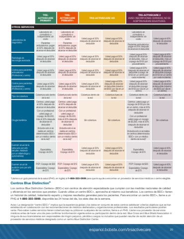 TRSACTIVECARE PRIMARYTRSACTIVECARE PRIMARY+TRS-ACTIVECARE HDTRS-ACTIVECARE 2 AVISO: INSCRIPCIONES CERRADAS; NO SE ACEPTAN NUEVAS SOLICITUDES.OTROS SERVICIOSLaboratorios de diagn%u00f3sticoLaboratorio en consultorio o independiente: sin costoLaboratorio en consultorio o independiente: sin costo Usted paga el 30% despu%u00e9s de alcanzar el deducibleUsted paga el 50% despu%u00e9s de alcanzar el deducibleLaboratorio en consultorio o independiente: sin costo Usted paga el 40% despu%u00e9s de alcanzar Pacientes el deducibleambulatorios: pagan el 30% despu%u00e9s de alcanzar el deduciblePacientes ambulatorios: pagan el 20% despu%u00e9s de alcanzar el deduciblePacientes ambulatorios: pagan el 20% despu%u00e9s de alcanzar el deducibleRadiolog%u00eda de tecnolog%u00eda avanzadaUsted paga el 30% despu%u00e9s de alcanzar el deducibleUsted paga el 20% despu%u00e9s de alcanzar el deducibleUsted paga el 30% despu%u00e9s de alcanzar el deducibleUsted paga el 50% despu%u00e9s de alcanzar el deducibleUsted paga el 20% despu%u00e9s de alcanzar el deducible, m%u00e1s un copago de $100 por procedimientoUsted paga el 40% despu%u00e9s de alcanzar el deducible, m%u00e1s un copago de $100 por procedimientoCostos para pacientes ambulatorios (Profesional y centro)Usted paga el 30% despu%u00e9s de alcanzar el deducibleUsted paga el 20% despu%u00e9s de alcanzar el deducibleUsted paga el 30% despu%u00e9s de alcanzar el deducibleUsted paga el 50% despu%u00e9s de alcanzar el deducibleUsted paga el 20% despu%u00e9s de alcanzar el deducible (copago de $150 en un centro por cada incidente)Usted paga el 40% despu%u00e9s de alcanzar el deducible (copago de $150 en un centro por cada incidente)Costos para pacientes hospitalizados (Profesional y centro)Usted paga el 30% despu%u00e9s de alcanzar el deducibleUsted paga el 20% despu%u00e9s de alcanzar el deducibleUsted paga el 30% despu%u00e9s de alcanzar el deducibleUsted paga el 50% despu%u00e9s de alcanzar el deducible (m%u00e1ximo de $500 por d%u00eda en un centro)Usted paga el 20% despu%u00e9s de alcanzar el deducible (copago de $150 por d%u00eda en un centro)Usted paga el 40% despu%u00e9s de alcanzar el deducible (m%u00e1ximo de $500 por d%u00eda en un centro)Tipo de cobertura Cobertura solo dentro de la redCobertura solo dentro de la redCobertura dentro de la redCobertura fuera de la redCobertura dentro de la redCobertura fuera de la redCirug%u00eda bari%u00e1tricaCentros: usted paga el 30% despu%u00e9s de alcanzar el deducibleCon un profesional: usted paga un copago de $5,000, m%u00e1s el 30% despu%u00e9s de alcanzar el deducible(Incluida solo si se realiza en centros determinados BDC+ con un m%u00e9dico dentro de la red)*Centros: usted paga el 20% despu%u00e9s de alcanzar el deducibleCon un profesional: usted paga un copago de $5,000, m%u00e1s el 20% despu%u00e9s de alcanzar el deducible(Incluida solo si se realiza en centros determinados BDC+ con un m%u00e9dico dentro de la red)*Sin cobertura Sin coberturaCentros: usted paga un copago de $150 por d%u00eda en un centro, m%u00e1s el 20% despu%u00e9s de alcanzar el deducible Con un profesional: usted paga un copago de $5,000, m%u00e1s el 20% despu%u00e9s de alcanzar el deducible(Incluida solo si se realiza en centros determinados BDC+ con un m%u00e9dico dentro de la red)*Sin coberturaExamen anual de la vista (uno por a%u00f1o del plan; realizado por un oftalm%u00f3logo u optometrista)Especialista Copago de $70 Especialista Copago de $70 Usted paga el 30% despu%u00e9s de alcanzar el deducibleUsted paga el 50% despu%u00e9s de alcanzar el deducibleEspecialista Copago de $70 Usted paga el 40% despu%u00e9s de alcanzar el deducibleExamen anual de audici%u00f3n (uno por a%u00f1o del plan)PCP: Copago de $30Especialista: Copago de $70 PCP: Copago de $15Especialista: Copago de $70 Usted paga el 30% despu%u00e9s de alcanzar el deducibleUsted paga el 50% despu%u00e9s de alcanzar el deduciblePCP: Copago de $30Especialista: Copago de $70 Usted paga el 40% despu%u00e9s de alcanzar el deducibleCentros Blue Distinction%u00aeLos centros Blue Distinction Centers+ (BDC+) son centros de atenci%u00f3n especializada que cumplen con las medidas nacionales de calidad y eficiencia en los servicios que prestan. Cuando utiliza un centro BDC+, aprovecha al m%u00e1ximo sus beneficios. Los centros de BDC+ tienen un historial de calidad, tratamiento experto y mejores resultados generales para los pacientes. Para encontrar un centro BDC+, llame a un PHG al 1%u2011866%u2011355%u20115999, disponible las 24 horas del d%u00eda, los siete d%u00edas de la semana.Aviso: La designaci%u00f3n %u201ccentro BDC+%u201d implica que la experiencia global y los datos en conjunto de estos centros satisfacen criterios objetivos que se han establecido en colaboraci%u00f3n con las recomendaciones de m%u00e9dicos destacados y organizaciones profesionales. Los resultados particulares podr%u00edan variar. Para saber cu%u00e1les servicios tienen cobertura bajo su p%u00f3liza en cualquiera de los centros, llame a un PHG. Llame a su proveedor de servicios m%u00e9dicos antes de hacer una cita para confirmar la informaci%u00f3n vigente sobre su participaci%u00f3n dentro de la red. Blue Cross and Blue Shield Association ni ninguna de sus licenciatarias son responsables de ning%u00fan perjuicio, p%u00e9rdida o cargos no incluidos que puedan resultar de recibir atenci%u00f3n de un proveedor de servicios m%u00e9dicos designado como un centro Blue Distinction Center.*Llame a un gu%u00eda personal de la salud (PHG, en ingl%u00e9s) al 1%u2011866%u2011355%u20115999 para que le ayude a encontrar un proveedor de servicios m%u00e9dicos o centro elegible.espanol.bcbstx.com/trsactivecare 25