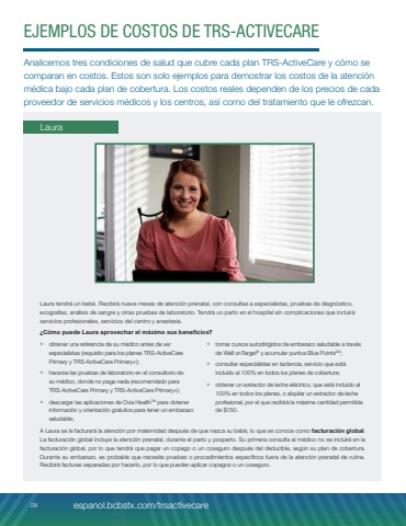 Laura tendr%u00e1 un beb%u00e9. Recibir%u00e1 nueve meses de atenci%u00f3n prenatal, con consultas a especialistas, pruebas de diagn%u00f3stico, ecograf%u00edas, an%u00e1lisis de sangre y otras pruebas de laboratorio. Tendr%u00e1 un parto en el hospital sin complicaciones que incluir%u00e1 servicios profesionales, servicios del centro y anestesia.%u00bfC%u00f3mo puede Laura aprovechar al m%u00e1ximo sus beneficios?%u2022 obtener una referencia de su m%u00e9dico antes de ver especialistas (requisito para los planes TRS%u2011ActiveCare Primary y TRS%u2011ActiveCare Primary+);%u2022 hacerse las pruebas de laboratorio en el consultorio de su m%u00e9dico, donde no paga nada (recomendado para TRS%u2011ActiveCare Primary y TRS%u2011ActiveCare Primary+);%u2022 descargar las aplicaciones de Ovia HealthTM para obtener informaci%u00f3n y orientaci%u00f3n gratuitos para tener un embarazo saludable;%u2022 tomar cursos autodirigidos de embarazo saludable a trav%u00e9s de Well onTarget%u00ae y acumular puntos Blue PointsSM;%u2022 consultar especialistas en lactancia, servicio que est%u00e1 incluido al 100% en todos los planes de cobertura;%u2022 obtener un extractor de leche el%u00e9ctrico, que est%u00e1 incluido al 100% en todos los planes, o alquilar un extractor de leche profesional, por el que recibir%u00e1 la m%u00e1xima cantidad permitida de $150.A Laura se le facturar%u00e1 la atenci%u00f3n por maternidad despu%u00e9s de que nazca su beb%u00e9, lo que se conoce como facturaci%u00f3n global. La facturaci%u00f3n global incluye la atenci%u00f3n prenatal, durante el parto y posparto. Su primera consulta al m%u00e9dico no se incluir%u00e1 en la facturaci%u00f3n global, por lo que tendr%u00e1 que pagar un copago o un coseguro despu%u00e9s del deducible, seg%u00fan su plan de cobertura. Durante su embarazo, es probable que necesite pruebas o procedimientos espec%u00edficos fuera de la atenci%u00f3n prenatal de rutina. Recibir%u00e1 facturas separadas por hacerlo, por lo que pueden aplicar copagos o un coseguro.EJEMPLOS DE COSTOS DE TRS-ACTIVECAREAnalicemos tres condiciones de salud que cubre cada plan TRS%u2011ActiveCare y c%u00f3mo se comparan en costos. Estos son solo ejemplos para demostrar los costos de la atenci%u00f3n m%u00e9dica bajo cada plan de cobertura. Los costos reales dependen de los precios de cada proveedor de servicios m%u00e9dicos y los centros, as%u00ed como del tratamiento que le ofrezcan.Laura28 espanol.bcbstx.com/trsactivecare