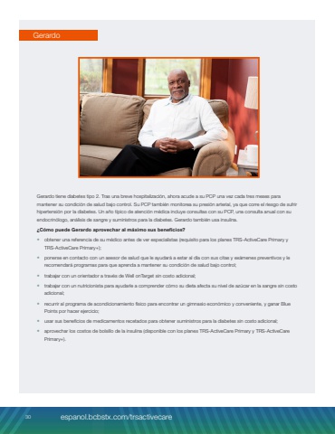 Gerardo tiene diabetes tipo 2. Tras una breve hospitalizaci%u00f3n, ahora acude a su PCP una vez cada tres meses para mantener su condici%u00f3n de salud bajo control. Su PCP tambi%u00e9n monitorea su presi%u00f3n arterial, ya que corre el riesgo de sufrir hipertensi%u00f3n por la diabetes. Un a%u00f1o t%u00edpico de atenci%u00f3n m%u00e9dica incluye consultas con su PCP, una consulta anual con su endocrin%u00f3logo, an%u00e1lisis de sangre y suministros para la diabetes. Gerardo tambi%u00e9n usa insulina.%u00bfC%u00f3mo puede Gerardo aprovechar al m%u00e1ximo sus beneficios?%u2022 obtener una referencia de su m%u00e9dico antes de ver especialistas (requisito para los planes TRS%u2011ActiveCare Primary y TRS%u2011ActiveCare Primary+);%u2022 ponerse en contacto con un asesor de salud que le ayudar%u00e1 a estar al d%u00eda con sus citas y ex%u00e1menes preventivos y le recomendar%u00e1 programas para que aprenda a mantener su condici%u00f3n de salud bajo control;%u2022 trabajar con un orientador a trav%u00e9s de Well onTarget sin costo adicional;%u2022 trabajar con un nutricionista para ayudarle a comprender c%u00f3mo su dieta afecta su nivel de az%u00facar en la sangre sin costo adicional;%u2022 recurrir al programa de acondicionamiento f%u00edsico para encontrar un gimnasio econ%u00f3mico y conveniente, y ganar Blue Points por hacer ejercicio;%u2022 usar sus beneficios de medicamentos recetados para obtener suministros para la diabetes sin costo adicional;%u2022 aprovechar los costos de bolsillo de la insulina (disponible con los planes TRS%u2011ActiveCare Primary y TRS%u2011ActiveCare Primary+).Gerardo30 espanol.bcbstx.com/trsactivecare
