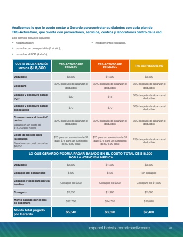 Analicemos lo que le puede costar a Gerardo para controlar su diabetes con cada plan de TRS%u2011ActiveCare, que cuenta con proveedores, servicios, centros y laboratorios dentro de la red.Este ejemplo incluye lo siguiente:%u2022 hospitalizaci%u00f3n;%u2022 consulta con un especialista (1 al a%u00f1o);%u2022 consultas al PCP (4 al a%u00f1o);%u2022 medicamentos recetados.COSTO DE LA ATENCI%u00d3N M%u00c9DICA $18,300TRS-ACTIVECARE PRIMARYTRS-ACTIVECARE PRIMARY+ TRS-ACTIVECARE HDDeducible $2,500 $1,200 $3,300Coseguro 30% despu%u00e9s de alcanzar el deducible20% despu%u00e9s de alcanzar el deducible30% despu%u00e9s de alcanzar el deducibleCopago y coseguro para el PCP $30 $15 30% despu%u00e9s de alcanzar el deducibleCopago y coseguro para el especialista $70 $70 30% despu%u00e9s de alcanzar el deducibleCoseguro para el hospital/centroBasado en un costo de $11,000 por noche30% despu%u00e9s de alcanzar el deducible20% despu%u00e9s de alcanzar el deducible30% despu%u00e9s de alcanzar el deducibleCosto de bolsillo para la insulinaBasado en un costo anual de $6,000$25 para un suministro de 31 d%u00edas; $75 para un suministro de 60 a 90 d%u00edas;$25 para un suministro de 31 d%u00edas; $75 para un suministro de 60 a 90 d%u00edas;25% despu%u00e9s de alcanzar el deducibleLO QUE GERARDO PODR%u00cdA PAGAR BASADO EN EL COSTO TOTAL DE $18,300 POR LA ATENCI%u00d3N M%u00c9DICADeducible $2,500 $1,200 $3,300Copagos del consultorio $190 $130 Sin copagosCopagos y coseguro para la insulina Copagos de $300 Copagos de $300 Coseguro de $1,500Coseguro $2,550 $1,960 $2,680Monto pagado por el plan de cobertura $12,760 $14,710 $10,820Monto total pagado por Gerardo $5,540 $3,590 $7,480espanol.bcbstx.com/trsactivecare 31
