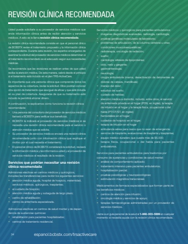 Usted puede solicitarle a su proveedor de servicios m%u00e9dicos que env%u00ede informaci%u00f3n cl%u00ednica antes de recibir atenci%u00f3n y servicios m%u00e9dicos. A esto se le llama revisi%u00f3n cl%u00ednica recomendada.La revisi%u00f3n cl%u00ednica recomendada consiste en que el personal cl%u00ednico de BCBSTX revise el tratamiento propuesto y la informaci%u00f3n cl%u00ednica correspondiente. Durante esta revisi%u00f3n, los expertos encargados de examinar la solicitud del proveedor de servicios m%u00e9dicos determinan si el tratamiento recomendado es el adecuado seg%u00fan sus necesidades m%u00e9dicas.Se recomienda que las revisiones se realicen antes de que usted reciba la atenci%u00f3n m%u00e9dica. De esta manera, sabr%u00e1 desde el principio si el tratamiento est%u00e1 incluido en el plan TRS%u2011ActiveCare.Es importante que una persona cl%u00ednica que comprenda todos los aspectos de su cobertura, revise la solicitud. Ellos podr%u00edan conocer otra opci%u00f3n de tratamiento que sea igual de eficaz y que est%u00e9 incluida en su plan de cobertura. Asegurarse de que su tratamiento est%u00e9 incluido le permitir%u00e1 ahorrar dinero.A continuaci%u00f3n, le explicamos c%u00f3mo funciona la revisi%u00f3n cl%u00ednica recomendada:%u2022 Una persona del consultorio del proveedor de servicios m%u00e9dicos llamar%u00e1 a BCBSTX para verificar sus beneficios.%u2022 BCBSTX le indicar%u00e1 al proveedor de servicios m%u00e9dicos si se necesita una revisi%u00f3n cl%u00ednica recomendada para el servicio o atenci%u00f3n m%u00e9dica que se solicita.%u2022 Su proveedor de servicios m%u00e9dicos enviar%u00e1 una revisi%u00f3n cl%u00ednica recomendada junto con informaci%u00f3n cl%u00ednica que explique el motivo por el cual necesita el tratamiento.%u2022 El personal cl%u00ednico de BCBSTX considerar%u00e1 la solicitud, revisar%u00e1 la informaci%u00f3n m%u00e9dica y les informar%u00e1 a usted y al proveedor de servicios m%u00e9dicos el resultado de la revisi%u00f3n.Servicios que podr%u00edan necesitar una revisi%u00f3n cl%u00ednica recomendadaAdmisiones electivas en centros m%u00e9dicos y quir%u00fargicos, incluidas las transferencias para recibir los siguientes servicios:%u2022 atenci%u00f3n m%u00e9dica aguda, hospital de hospicio, maternidad, servicios m%u00e9dicos, quir%u00fargicos, trasplantes;%u2022 el cuidado de hospicio;%u2022 atenci%u00f3n m%u00e9dica aguda y subaguda de largo plazo;%u2022 centro de rehabilitaci%u00f3n;%u2022 centro de enfermer%u00eda especializada.Admisiones electivas en centros de salud mental y de depen%u2011dencia de sustancias qu%u00edmicas:%u2022 rehabilitaci%u00f3n para pacientes hospitalizados;%u2022 centros de tratamiento residencial.Servicios m%u00e9dicos y quir%u00fargicos para pacientes ambulatorios:%u2022 im%u00e1genes diagn%u00f3sticas avanzadas, radiolog%u00eda, cardiolog%u00eda;%u2022 pruebas gen%u00e9ticas moleculares de laboratorio;%u2022 problemas de articulaci%u00f3n, de la columna vertebral u otras condiciones musculoesquel%u00e9ticas;%u2022 radioterapia, oncolog%u00eda de radiaci%u00f3n;%u2022 sue%u00f1o;%u2022 cardiolog%u00eda: af%u00e9resis de lipoprote%u00ednas;%u2022 o%u00eddo, nariz y garganta;%u2022 gastroenterolog%u00eda;%u2022 neurolog%u00eda;%u2022 cirug%u00eda ambulatoria (mama, desactivaci%u00f3n de detonantes de dolores de cabeza, mand%u00edbula);%u2022 manejo del dolor;%u2022 estudios del sue%u00f1o;%u2022 cuidado de heridas;%u2022 atenci%u00f3n m%u00e9dica a domicilio, incluido, entre otros, el servicio de enfermer%u00eda privada en el hogar (PDN, en ingl%u00e9s), la terapia de infusi%u00f3n en el hogar y la terapia f%u00edsica, ocupacional o del habla (PT/OT/ST, en ingl%u00e9s);%u2022 hemodi%u00e1lisis en el hogar;%u2022 cuidados de hospicio en el hogar;%u2022 terapia de infusi%u00f3n en el hogar%u2022 ambulancia a%u00e9rea para casos que no sean de emergencia;%u2022 servicios de trasplante, evaluaciones de trasplante y trasplantes;%u2022 equipo m%u00e9dico duradero que cueste m%u00e1s de $5,000;%u2022 terapia f%u00edsica, ocupacional o del habla para pacientes ambulatorios.Servicios para pacientes ambulatorios para trastornos por consumo de sustancias y condiciones de salud mental:%u2022 an%u00e1lisis de comportamiento aplicado;%u2022 tratamiento intensivo para pacientes ambulatorios;%u2022 hospitalizaci%u00f3n parcial;%u2022 pruebas psicol%u00f3gicas y neuropsicol%u00f3gicas;%u2022 estimulaci%u00f3n magn%u00e9tica transcraneal.Medicamentos de farmacia especializados que forman parte de los beneficios m%u00e9dicos:%u2022 centros de atenci%u00f3n para infusi%u00f3n;%u2022 oncolog%u00eda m%u00e9dica y servicios de apoyo;%u2022 terapias farmacol%u00f3gicas administradas por un proveedor de servicios m%u00e9dicos.Llame a un gu%u00eda personal de la salud al 1%u2011866%u2011355%u20115999 en cualquier momento si necesita ayuda con la revisi%u00f3n cl%u00ednica recomendada.REVISI%u00d3N CL%u00cdNICA RECOMENDADA34 espanol.bcbstx.com/trsactivecare