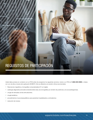 Usted debe ponerse en contacto con un PHG antes de programar los siguientes servicios. Llame a un PHG al 1-866-355-5999 o chatee con uno de ellos a trav%u00e9s de la aplicaci%u00f3n BCBSTX. Esto es diferente a la revisi%u00f3n cl%u00ednica recomendada.%u2022 Resonancia magn%u00e9tica y tomograf%u00edas computarizadas (CT, en ingl%u00e9s);%u2022 radiolog%u00eda diagn%u00f3stica (incluida la densitometr%u00eda %u00f3sea, las tomograf%u00edas por emisi%u00f3n de positrones y los ecocardiogramas);%u2022 cirug%u00eda de reemplazo de las articulaciones;%u2022 cirug%u00eda bari%u00e1trica;%u2022 procedimientos musculoesquel%u00e9ticos para pacientes hospitalizados y ambulatorios;%u2022 reducci%u00f3n de mamas.REQUISITOS DE PARTICIPACI%u00d3Nespanol.bcbstx.com/trsactivecare 35