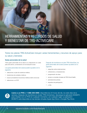 Todos los planes TRS%u2011ActiveCare incluyen varias herramientas y recursos de apoyo para su salud y bienestar.Gu%u00edas personales de la saludTiene gu%u00edas personales de la salud a su disposici%u00f3n en cadapaso del camino, comenzando con la inscripci%u00f3n anual.Los gu%u00edas personales de la salud pueden ayudarle con lo siguiente:%u2022 seleccionar un plan de cobertura m%u00e9dica;%u2022 transiciones de cuidados m%u00e9dicos;%u2022 buscar proveedores de servicios m%u00e9dicos dentro de la red;%u2022 seleccionar a un PCP.Despu%u00e9s de inscribirse en el plan TRS%u2011ActiveCare, los gu%u00edas personales de la salud pueden ayudarle con lo siguiente:%u2022 preguntas sobre reclamaciones;%u2022 cotizaciones y comparaciones;%u2022 programaci%u00f3n de citas;%u2022 acceso a consultas virtuales de TRS Virtual Health;%u2022 autorizaciones previas;%u2022 requisitos de participaci%u00f3n;%u2022 y m%u00e1s.Llame a un PHG al 1%u2011866%u2011355%u20115999, disponible las 24 horas del d%u00eda, los siete d%u00edas de la semana. Despu%u00e9s de inscribirse en el plan TRS%u2011ActiveCare, descargue la aplicaci%u00f3n BCBSTX para chatear con un PHG en cualquier momento y en cualquier lugar. La aplicaci%u00f3n BCBSTX est%u00e1 disponible en las tiendas virtuales Apple App Store o Google Play Store.HERRAMIENTAS Y RECURSOS DE SALUD Y BIENESTAR DE TRS-ACTIVECARE38 espanol.bcbstx.com/trsactivecare