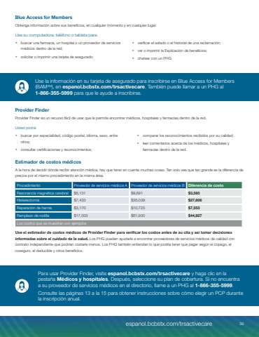 Use la informaci%u00f3n en su tarjeta de asegurado para inscribirse en Blue Access for Members (BAMSM), en espanol.bcbstx.com/trsactivecare. Tambi%u00e9n puede llamar a un PHG al 1%u2011866%u2011355%u20115999 para que le ayude a inscribirse.Blue Access for MembersObtenga informaci%u00f3n sobre sus beneficios, en cualquier momento y en cualquier lugar.Use su computadora, tel%u00e9fono o tableta para:%u2022 buscar una farmacia, un hospital o un proveedor de servicios m%u00e9dicos dentro de la red;%u2022 solicitar o imprimir una tarjeta de asegurado;%u2022 verificar el estado o el historial de una reclamaci%u00f3n;%u2022 ver o imprimir la Explicaci%u00f3n de beneficios;%u2022 chatear con un PHG.Provider FinderProvider Finder es un recurso f%u00e1cil de usar que le permite encontrar m%u00e9dicos, hospitales y farmacias dentro de la red.Usted podr%u00e1:%u2022 buscar por especialidad, c%u00f3digo postal, idioma, sexo, entre otros;%u2022 consultar certificaciones y reconocimientos;%u2022 comparar los reconocimientos recibidos por su calidad;%u2022 leer comentarios acerca de los m%u00e9dicos, hospitales y farmacias dentro de la red.Para usar Provider Finder, visite espanol.bcbstx.com/trsactivecare y haga clic en la pesta%u00f1a M%u00e9dicos y hospitales. Despu%u00e9s, seleccione su plan de cobertura. Si no encuentra a su proveedor de servicios m%u00e9dicos en el directorio, llame a un PHG al 1%u2011866%u2011355%u20115999.Consulte las p%u00e1ginas 13 a la 15 para obtener instrucciones sobre c%u00f3mo elegir un PCP durante la inscripci%u00f3n anual.Estimador de costos m%u00e9dicosA la hora de decidir d%u00f3nde recibir atenci%u00f3n m%u00e9dica, hay que tener en cuenta muchas cosas. Tan solo vea que tan grande es la diferencia de precios por el mismo procedimiento en la misma %u00e1rea.Procedimiento Proveedor de servicios m%u00e9dicos A Proveedor de servicios m%u00e9dicos B Diferencia de costoResonancia magn%u00e9tica cerebral $5,131 $8,691 $3,560Histerectom%u00eda $7,433 $35,039 $27,606Reparaci%u00f3n de hernia $3,170 $10,723 $7,553Remplazo de rodilla $17,003 $61,930 $44,927Los costos que se muestran son ejemplos.Use el estimador de costos m%u00e9dicos de Provider Finder para verificar los costos antes de su cita y as%u00ed tomar decisiones informadas sobre el cuidado de la salud. Los PHG pueden ayudarle a encontrar proveedores de servicios m%u00e9dicos de calidad con contrato independiente que podr%u00edan costarle menos. Los PHG tambi%u00e9n entienden lo que podr%u00eda tener que pagar seg%u00fan el copago, el coseguro, el deducible y otros beneficios.espanol.bcbstx.com/trsactivecare 39