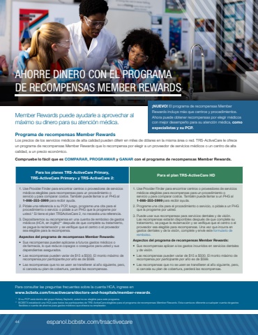 AHORRE DINERO CON EL PROGRAMA DE RECOMPENSAS MEMBER REWARDSPara consultar las preguntas frecuentes sobre la cuenta HCA, ingrese en www.bcbstx.com/trsactivecare/doctors-and-hospitals/member-rewards. * Si su PCP est%u00e1 dentro del grupo Kelsey Seybold, usted no es elegible para este programa.** BCBSTX estableci%u00f3 una HCA para todos los participantes de TRS%u2011ActiveCare elegibles para el programa de recompensas Member Rewards. Esta cuenta es diferente a cualquier cuenta de gastos flexibles o cuenta de ahorros para gastos m%u00e9dicos que ofrezca su empleador.%u00a1NUEVO! El programa de recompensas Member Rewards incluye m%u00e1s que centros y procedimientos. Ahora puede obtener recompensas por elegir m%u00e9dicos con mejor desempe%u00f1o para su atenci%u00f3n m%u00e9dica, como especialistas y su PCP.Member Rewards puede ayudarle a aprovechar al m%u00e1ximo su dinero para su atenci%u00f3n m%u00e9dica. Programa de recompensas Member RewardsLos precios de los servicios m%u00e9dicos de alta calidad pueden diferir en miles de d%u00f3lares en la misma %u00e1rea o red. TRS%u2011ActiveCare le ofrece un programa de recompensas Member Rewards que lo recompensa por elegir a un proveedor de servicios m%u00e9dicos o un centro de alta calidad, a un precio econ%u00f3mico.Compruebe lo f%u00e1cil que es COMPARAR, PROGRAMAR y GANAR con el programa de recompensas Member Rewards.Para los planes TRS%u2011ActiveCare Primary,TRS%u2011ActiveCare Primary+ y TRS%u2011ActiveCare 2: Para el plan TRS%u2011ActiveCare HD1. Use Provider Finder para encontrar centros o proveedores de servicios m%u00e9dicos elegibles para recompensas para un procedimiento o servicio y para comparar costos. Tambi%u00e9n puede llamar a un PHG al 1%u2011866%u2011355%u20115999 para recibir ayuda.2. P%u00eddale una referencia a su PCP, luego, programe una cita para el procedimiento o servicio o p%u00eddale a un PHG que la programe por usted.* Si tiene el plan TRSActiveCare 2, no necesita una referencia.3. Depositaremos su recompensa en una cuenta de rembolso de gastos m%u00e9dicos (HCA, en ingl%u00e9s)** despu%u00e9s de que complete su tratamiento, se pague la reclamaci%u00f3n y se verifique que el centro o el proveedor sea elegible para la recompensa.Aspectos del programa de recompensas Member Rewards:%u2022 Sus recompensas pueden aplicarse a futuros gastos m%u00e9dicos o de farmacia, lo que reduce copagos o coseguros para usted y sus dependientes asegurados.%u2022 Las recompensas pueden variar de $15 a $500. El monto m%u00e1ximo de recompensa por participante por a%u00f1o es de $599.%u2022 Las recompensas que no se usen se transfieren al a%u00f1o siguiente, pero, si cancela su plan de cobertura, perder%u00e1 las recompensas.1. Use Provider Finder para encontrar centros o proveedores de servicios m%u00e9dicos elegibles para recompensas para un procedimiento o servicio y para comparar costos. Tambi%u00e9n puede llamar a un PHG al 1%u2011866%u2011355%u20115999 para recibir ayuda.2. Programe una cita para el procedimiento o servicio, o p%u00eddale a un PHG que la programe por usted.3. Puede usar sus recompensas para servicios dentales y de visi%u00f3n. Las recompensas estar%u00e1n disponibles despu%u00e9s de que complete su tratamiento, se pague la reclamaci%u00f3n y se verifique que el centro o el proveedor sea elegible para recompensas. Una vez que incurra en gastos dentales y de la visi%u00f3n, complete y env%u00ede este formulario de rembolso.Aspectos del programa de recompensas Member Rewards:%u2022 Sus recompensas aplican a los gastos incurridos en servicios dentales y de visi%u00f3n.%u2022 Las recompensas pueden variar de $15 a $500. El monto m%u00e1ximo de recompensa por participante por a%u00f1o es de $599.%u2022 Las recompensas que no se usen se transfieren al a%u00f1o siguiente, pero, si cancela su plan de cobertura, perder%u00e1 las recompensas.44 espanol.bcbstx.com/trsactivecare