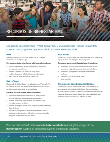 RECURSOS DE BIENESTAR HMOLos planes Blue Essentials - West Texas HMO y Blue Essentials - South Texas HMO cuentan con programas que le ayudar%u00e1n a mantenerse saludable.BAMObtenga informaci%u00f3n sobre sus beneficios, en cualquier momento y en cualquier lugar.Use su computadora, tel%u00e9fono o tableta para lo siguiente:%u2022 buscar un proveedor de servicios m%u00e9dicos, hospital o farmacia dentro de la red;%u2022 solicitar o imprimir una tarjeta de asegurado;%u2022 verificar el estado o el historial de una reclamaci%u00f3n;%u2022 ver o imprimir la Explicaci%u00f3n de beneficios.Well onTargetEl sitio web de Well onTarget y la aplicaci%u00f3n m%u00f3vil AlwaysOn%u00ae le ayudar%u00e1n a alcanzar sus objetivos de bienestar y controlar sus condiciones de salud, todo en un solo lugar.Con Well onTarget, puede hacer lo siguiente:%u2022 completar una Evaluaci%u00f3n de salud en l%u00ednea y recibir recomendaciones personalizadas para su salud;%u2022 obtener orientaci%u00f3n personalizada por tel%u00e9fono o por mensajes seguros en l%u00ednea;%u2022 obtener ayuda para perder peso, mejorar la presi%u00f3n arterial y dejar de fumar;%u2022 conectar sus dispositivos de acondicionamiento f%u00edsico y aplicaciones de nutrici%u00f3n o utilice los monitores integrados del portal para mantenerse saludable.Blue Points%u00a1Obtenga puntos por estar saludable y canj%u00e9elos por tarjetas de regalo cuando est%u00e9 listo para darse un gusto!Para ganar puntos, usted puede hacer lo siguiente:%u2022 completar una Evaluaci%u00f3n de salud dos veces al a%u00f1o;%u2022 conectar un dispositivo de acondicionamiento f%u00edsico;%u2022 completar un programa autodirigido de bienestar en l%u00ednea;%u2022 trabajar con un promotor de salud;%u2022 hacer ejercicio.Programa de acondicionamiento f%u00edsicoTome control de sus objetivos de salud e inscr%u00edbase en el programa de acondicionamiento f%u00edsico. Con membres%u00edas econ%u00f3micas sin contrato, puede ir a cualquier gimnasio en la red nacional. Cuenta con cinco planes diferentes para elegir, que incluyen una opci%u00f3n virtual por solo $10 al mes.Para acceder a BAM, visite www.bcbstx.com/trshmo (en ingl%u00e9s) y haga clic en Iniciar sesi%u00f3n (Log in) en la esquina superior derecha de la p%u00e1gina.46 espanol.bcbstx.com/trsactivecare