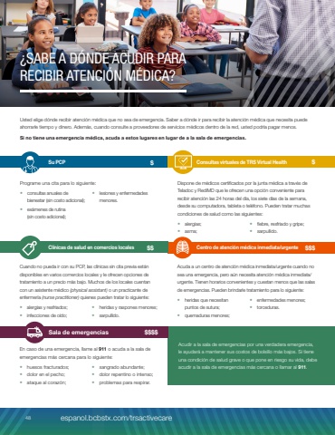 Usted elige d%u00f3nde recibir atenci%u00f3n m%u00e9dica que no sea de emergencia. Saber a d%u00f3nde ir para recibir la atenci%u00f3n m%u00e9dica que necesita puede ahorrarle tiempo y dinero. Adem%u00e1s, cuando consulte a proveedores de servicios m%u00e9dicos dentro de la red, usted podr%u00eda pagar menos.Si no tiene una emergencia m%u00e9dica, acuda a estos lugares en lugar de a la sala de emergencias.Centro de atenci%u00f3n m%u00e9dica inmediata/urgenteAcuda a un centro de atenci%u00f3n m%u00e9dica inmediata/urgente cuando no sea una emergencia, pero a%u00fan necesita atenci%u00f3n m%u00e9dica inmediata/urgente. Tienen horarios convenientes y cuestan menos que las salas de emergencias. Pueden brindarle tratamiento para lo siguiente:%u2022 heridas que necesitan puntos de sutura;%u2022 quemaduras menores;%u2022 enfermedades menores;%u2022 torceduras.$$Sala de emergenciasEn caso de una emergencia, llame al 911 o acuda a la sala de emergencias m%u00e1s cercana para lo siguiente:%u2022 huesos fracturados;%u2022 dolor en el pecho;%u2022 ataque al coraz%u00f3n;%u2022 sangrado abundante;%u2022 dolor repentino o intenso;%u2022 problemas para respirar.$$Acudir a la sala de emergencias por una verdadera emergencia, le ayudar%u00e1 a mantener sus costos de bolsillo m%u00e1s bajos. Si tiene una condici%u00f3n de salud grave o que pone en riesgo su vida, debe acudir a la sala de emergencias m%u00e1s cercana o llamar al 911.Su PCP $Programe una cita para lo siguiente:%u2022 consultas anuales de bienestar (sin costo adicional);%u2022 ex%u00e1menes de rutina (sin costo adicional);%u2022 lesiones y enfermedades menores.Cl%u00ednicas de salud en comercios locales $Cuando no pueda ir con su PCP, las cl%u00ednicas sin cita previa est%u00e1n disponibles en varios comercios locales y le ofrecen opciones de tratamiento a un precio m%u00e1s bajo. Muchos de los locales cuentan con un asistente m%u00e9dico (physical assistant) o un practicante de enfermer%u00eda (nurse practitioner) quienes pueden tratar lo siguiente:%u2022 alergias y resfriados;%u2022 infecciones de o%u00eddo;%u2022 heridas y raspones menores;%u2022 sarpullido.Consultas virtuales de TRS Virtual Health $Dispone de m%u00e9dicos certificados por la junta m%u00e9dica a trav%u00e9s de Teladoc y RediMD que le ofrecen una opci%u00f3n conveniente para recibir atenci%u00f3n las 24 horas del d%u00eda, los siete d%u00edas de la semana, desde su computadora, tableta o tel%u00e9fono. Pueden tratar muchas condiciones de salud como las siguientes:%u2022 alergias;%u2022 asma;%u2022 fiebre, resfriado y gripe;%u2022 sarpullido.%u00bfSABE A D%u00d3NDE ACUDIR PARA RECIBIR ATENCI%u00d3N M%u00c9DICA?48 espanol.bcbstx.com/trsactivecare