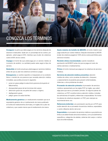 Coseguro: la parte que debe pagar por los servicios despu%u00e9s de alcanzar el deducible. Suele ser un porcentaje de los costos; por ejemplo, usted paga el 20% mientras que el plan de cobertura cubre el 80% de los costos.Copago: el monto fijo que usted paga por un servicio m%u00e9dico al momento de recibirlo. La cantidad puede variar seg%u00fan el tipo de servicio.Deducible: el monto anual que usted paga por servicios m%u00e9dicos antes de que su plan de cobertura comience a pagar.Emergencia: un cambio repentino e inesperado en la condici%u00f3n f%u00edsica o mental de una persona que necesita atenci%u00f3n m%u00e9dica inmediata, que podr%u00eda provocar lo siguiente:%u2022 poner en grave peligro la salud de la persona (incluyendo el fallecimiento);%u2022 discapacidad grave de las funciones del cuerpo;%u2022 disfunci%u00f3n grave de una parte del cuerpo u %u00f3rgano;%u2022 desfiguraci%u00f3n grave;%u2022 peligro grave a la salud del feto.Medicamento gen%u00e9rico: un medicamento recetado que es el equivalente gen%u00e9rico de un medicamento de marca publicado en la lista de medicamentos (formulary, en ingl%u00e9s) de su plan de cobertura y que cuesta menos que el medicamento de marca.Gasto m%u00e1ximo de bolsillo de (MOOP): el monto m%u00e1ximo que paga cada a%u00f1o por costos m%u00e9dicos. Despu%u00e9s de alcanzar su MOOP, el plan de cobertura pagar%u00e1 el 100% de los costos permitidos para servicios incluidos.Revisi%u00f3n cl%u00ednica recomendada: cuando necesita la aprobaci%u00f3n de BCBSTX antes de que se pague el costo de ciertos servicios o medicamentos.Prima: el monto mensual que paga por la cobertura de servicios m%u00e9dicos.Servicios de atenci%u00f3n m%u00e9dica preventiva: atenci%u00f3n m%u00e9dica de rutina, como pruebas de detecci%u00f3n, chequeos y asesoramiento al paciente para prevenir enfermedades, dolencias u otros problemas de salud.Proveedor de atenci%u00f3n primaria: el proveedor de servicios m%u00e9dicos representado por las siglas PCP en ingl%u00e9s, que usted elige para que sea su proveedor primario. En algunos planes de cobertura, su PCP coordina toda su atenci%u00f3n m%u00e9dica, incluidas las admisiones al hospital y referencias a especialistas. No todos los planes de cobertura requieren un PCP, pero siempre se recomienda tener uno.Referencia (referido): una autorizaci%u00f3n escrita por el PCP para recibir atenci%u00f3n de un proveedor de servicios m%u00e9dicos, especialista o centro diferente dentro de la red.Especialista: un proveedor de servicios m%u00e9dicos cuya pr%u00e1ctica se limita a una determinada rama de la medicina, como procedimientos espec%u00edficos, categor%u00edas de edades, sistemas del cuerpo o ciertos tipos de enfermedades.CONOZCA LOS T%u00c9RMINOSespanol.bcbstx.com/trsactivecare 5