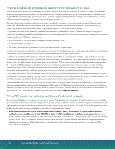 Aviso de pr%u00e1cticas de privacidad de Teacher Retirement System of TexasTeacher Retirement System of Texas administra los beneficios de salud de su plan de cobertura y su pensi%u00f3n conforme a la ley federal y estatal de Texas. Este aviso es requerido por las regulaciones de privacidad basadas en la Ley de Portabilidad y Responsabilidad de los Seguros M%u00e9dicos de 1996, seg%u00fan las enmiendas de la Ley de Tecnolog%u00eda de la Informaci%u00f3n de Salud para la Salud Econ%u00f3mica y Cl%u00ednica (Health Information Technology for Economic and Clinical Health Act) de 2009.Este aviso describe c%u00f3mo su informaci%u00f3n de salud puede ser utilizada y divulgada y c%u00f3mo usted puede conseguir el acceso a esta informaci%u00f3n. Revise este aviso cuidadosamente. Este aviso tambi%u00e9n establece las obligaciones legales de TRS con respecto a su informaci%u00f3n de salud. Adem%u00e1s, este aviso describe sus derechos para controlar su informaci%u00f3n de salud.La ley federal requiere que TRS mantenga y proteja la privacidad de su informaci%u00f3n de salud. Su informaci%u00f3n de salud protegida es informaci%u00f3n de salud que le identifica individualmente, e incluye informaci%u00f3n gen%u00e9tica e informaci%u00f3n demogr%u00e1fica, que se obtiene de usted o creada o recibida por TRS que se relaciona con:%u2022 su condici%u00f3n f%u00edsica o de salud mental, ya sea en el pasado, presente o futuro;%u2022 la atenci%u00f3n m%u00e9dica que recibe; o%u2022 los pagos, ya sean pasados, presentes o futuros, por atenci%u00f3n m%u00e9dica proporcionada.La informaci%u00f3n de salud protegida que no est%u00e1 segura es informaci%u00f3n de salud protegida que no est%u00e1 asegurada utilizando una tecnolog%u00eda o metodolog%u00eda que hace que la informaci%u00f3n de salud protegida sea inutilizable, ilegible o indescifrable.La fecha de comienzo de este aviso fue el 14 de abril de 2003, y se modific%u00f3 el 1 de septiembre de 2020. La ley de Texas ya hace que su informaci%u00f3n de asegurado, incluida su informaci%u00f3n de salud protegida, sea confidencial. Por lo tanto, seg%u00fan la implementaci%u00f3n original de este aviso y la implementaci%u00f3n de este aviso seg%u00fan su modificaci%u00f3n, TRS no cambi%u00f3 ni cambiar%u00e1 el modo de proteger su informaci%u00f3n. El 14 de abril de 2003 se aplicaron autom%u00e1ticamente los nuevos derechos y otros t%u00e9rminos de este aviso, seg%u00fan se hab%u00edan dise%u00f1ado originalmente. Por lo tanto, se seguir%u00e1n aplicando autom%u00e1ticamente los derechos y otros t%u00e9rminos de este aviso seg%u00fan las revisiones posteriores. No tiene que hacer nada para solicitar la protecci%u00f3n de la privacidad de su informaci%u00f3n de salud.La ley federal requiere que TRS le proporcione este aviso el cual incluye sus pr%u00e1cticas de privacidad y sus obligaciones legales en cuanto a su informaci%u00f3n de salud protegida. Este aviso explica c%u00f3mo, cu%u00e1ndo y por qu%u00e9 TRS usa y divulga su informaci%u00f3n de salud protegida. Por ley, TRS debe seguir las pr%u00e1cticas de privacidad que se describen en el aviso de privacidad m%u00e1s reciente.TRS se reserva el derecho de cambiar sus pr%u00e1cticas de privacidad y los t%u00e9rminos de este aviso en cualquier momento. Los cambios ser%u00e1n efectivos para toda su informaci%u00f3n de salud protegida que TRS mantiene. Si TRS hace un cambio importante que afecte al contenido de este aviso, le enviar%u00e1 un nuevo aviso por correo postal en un plazo de 60 d%u00edas a partir del d%u00eda en que se hizo el cambio. Este aviso est%u00e1 en el sitio web de TRS, y TRS publicar%u00e1 cualquier aviso nuevo en su sitio web en www.trs.texas.gov.C%u00f3mo TRS puede usar y divulgar su informaci%u00f3n de salud protegidaCiertos usos y divulgaciones no requieren su permiso por escrito. Para cualquier uso o divulgaci%u00f3n de su informaci%u00f3n de salud protegida que se describe a continuaci%u00f3n, TRS o los integrantes de la Junta M%u00e9dica, auditores, asesores actuariales, abogados, administradores del plan de cobertura o administradores de beneficios de farmacia que act%u00faen en nombre de TRS, TRS%u2011Care o TRS%u2011ActiveCare pueden usar y divulgar su informaci%u00f3n de salud protegida sin su permiso por escrito (una autorizaci%u00f3n).%u2022 Para todas las actividades que se incluyen en las definiciones de %u201cpago%u201d, %u201ctratamiento%u201d y %u201coperaciones de atenci%u00f3n m%u00e9dica%u201d como se establece en el t%u00edtulo 45 C.F.R., art%u00edculo 164.501, incluido lo que se indica a continuaci%u00f3n. Este aviso no incluye todas las actividades descritas en estas definiciones, consulte la secci%u00f3n 45 C.F.R., art%u00edculo 164.501 para ver una lista completa. Cuando se usa %u201cTRS%u201d a continuaci%u00f3n al describir estos motivos, se tiene la intenci%u00f3n de incluir a los auditores, asesores actuariales, abogados, administradores del plan de cobertura y administradores de beneficios de farmacia que act%u00faen en nombre de TRS, TRS%u2011Care o TRS%u2011ActiveCare.58 espanol.bcbstx.com/trsactivecare