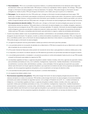 %u2022 Para tratamiento. TRS no es un proveedor de servicios m%u00e9dicos y no participa directamente en las decisiones sobre ning%u00fan tipo de tratamiento m%u00e9dico que usted debe recibir. TRS tampoco conserva sus expedientes m%u00e9dicos vigentes. Sin embargo, TRS puede divulgar su informaci%u00f3n de salud protegida con fines de tratamiento. Por ejemplo, TRS podr%u00eda divulgar su informaci%u00f3n de salud protegida si su m%u00e9dico le pide a TRS que divulgue la informaci%u00f3n a otro m%u00e9dico para que lo ayude con su tratamiento.%u2022 Para pagos. Hay dos ejemplos de c%u00f3mo TRS podr%u00eda usar o divulgar su informaci%u00f3n de salud protegida para hacer pagos. TRS podr%u00eda usar o divulgar su informaci%u00f3n para preparar una factura por servicios m%u00e9dicos para usted u otra persona o para la compa%u00f1%u00eda responsable de pagar la factura. La factura podr%u00eda incluir informaci%u00f3n que lo identifica, los servicios m%u00e9dicos que recibi%u00f3 y por qu%u00e9 los recibi%u00f3. El segundo ejemplo ser%u00eda que TRS puede usar o divulgar su informaci%u00f3n de salud protegida para obtener el pago de la prima.%u2022 Para operaciones de atenci%u00f3n m%u00e9dica. TRS podr%u00eda usar o divulgar su informaci%u00f3n de salud protegida para apoyar las funciones administrativas del plan de cobertura. TRS puede ofrecer su informaci%u00f3n de salud protegida a sus contables, abogados, asesores u otras personas que se aseguran de que TRS cumpla con las leyes aplicables. Por ejemplo, informaci%u00f3n de salud protegida protegida podr%u00eda entregarse a personas que estudian la calidad de la atenci%u00f3n m%u00e9dica que recibi%u00f3. Otro ejemplo de operaciones de atenci%u00f3n m%u00e9dica ser%u00eda que TRS usara y compartiera esta informaci%u00f3n para administrar su negocio y realizar las actividades administrativas.%u2022 Cuando la ley federal, estatal o local, los procedimientos judiciales o administrativos o las autoridades policiales requieren el uso o la divulgaci%u00f3n de esta informaci%u00f3n. Por ejemplo, al recibir su solicitud de beneficios de jubilaci%u00f3n por discapacidad, TRS y los integrantes de la Junta M%u00e9dica podr%u00edan usar su informaci%u00f3n de salud protegida para determinar si tiene derecho a una jubilaci%u00f3n por discapacidad. TRS podr%u00eda divulgar su informaci%u00f3n de salud protegida:%u2022 una agencia de aplicaci%u00f3n de la ley penal federal o estatal que solicita la informaci%u00f3n para fines policiales;%u2022 a una autoridad policial con el prop%u00f3sito de alertarles de su fallecimiento si TRS tiene la sospecha de que su fallecimiento pudo haber sido el resultado de una conducta criminal;%u2022 al Procurador General de Texas para cobrar pensi%u00f3n de manutenci%u00f3n de los hijos o para garantizar la cobertura m%u00e9dica para su hijo;%u2022 en respuesta a una citaci%u00f3n si el director ejecutivo de TRS determina que tendr%u00e1 una oportunidad razonable de impugnar la citaci%u00f3n;%u2022 a una entidad gubernamental, un empleador o una persona que act%u00fae en nombre del empleador hasta el punto en que TRS necesita compartir la informaci%u00f3n para realizar los negocios de TRS;%u2022 a la Asamblea Legislativa de Texas o a agencias del gobierno estatal o federal, incluidas, entre otros, agencias de supervisi%u00f3n m%u00e9dica para actividades autorizadas por la ley, como auditor%u00edas, investigaciones, inspecciones, medidas disciplinarias o de licenciamiento, procedimientos o acciones civiles, administrativas o penales, u otras actividades. Entre las agencias de supervisi%u00f3n que pueden obtener esta informaci%u00f3n se incluyen agencias del gobierno que supervisan (i) el sistema de salud, (ii) los programas de beneficios del gobierno, (iii) otros programas regulatorios del gobierno y (iv) el cumplimiento con las leyes de derechos civiles;%u2022 a una autoridad de salud p%u00fablica para los fines de prevenir o controlar enfermedades; y%u2022 si lo requiere la ley federal, estatal o local.%u2022 Para funciones espec%u00edficas del gobierno. TRS podr%u00eda divulgar informaci%u00f3n de salud protegida protegida del personal militar y veteranos del ej%u00e9rcito en ciertas circunstancias. TRS tambi%u00e9n podr%u00eda divulgar informaci%u00f3n de salud protegida a funcionarios federales autorizados para realizar actividades de seguridad nacional, como proteger al Presidente de los EE. UU., o realizar actividades de inteligencia, o a la Asamblea Legislativa de Texas o a agencias del gobierno estatal o federal, incluidas, entre otros, agencias de supervisi%u00f3n m%u00e9dica para actividades autorizadas por la ley, como auditor%u00edas, investigaciones, inspecciones, medidas disciplinarias o de licenciamiento, procedimientos o acciones civiles, administrativas o penales, u otras actividades. Entre las agencias de supervisi%u00f3n que pueden obtener esta informaci%u00f3n se incluyen agencias del gobierno que supervisan (i) el sistema de salud, (ii) los programas de beneficios del gobierno, (iii) otros programas regulatorios del gobierno y (iv) en cumplimiento con las leyes de derechos civiles.espanol.bcbstx.com/trsactivecare 59