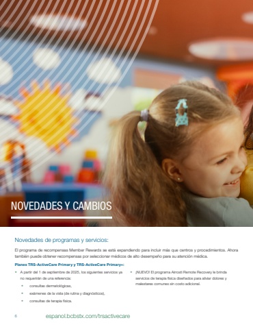 NOVEDADES Y CAMBIOSNovedades de programas y servicios:El programa de recompensas Member Rewards se est%u00e1 expandiendo para incluir m%u00e1s que centros y procedimientos. Ahora tambi%u00e9n puede obtener recompensas por seleccionar m%u00e9dicos de alto desempe%u00f1o para su atenci%u00f3n m%u00e9dica.Planes TRS-ActiveCare Primary y TRS-ActiveCare Primary+:%u2022 A partir del 1 de septiembre de 2025, los siguientes servicios ya no requerir%u00e1n de una referencia:%u2022 consultas dermatol%u00f3gicas,%u2022 ex%u00e1menes de la vista (de rutina y diagn%u00f3sticos),%u2022 consultas de terapia f%u00edsica.%u2022 %u00a1NUEVO! El programa Airrosti Remote Recovery le brinda servicios de terapia f%u00edsica dise%u00f1ados para aliviar dolores y malestares comunes sin costo adicional.6 espanol.bcbstx.com/trsactivecare