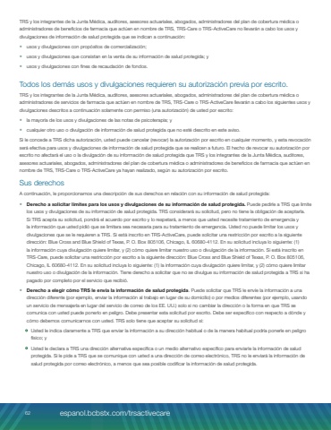 TRS y los integrantes de la Junta M%u00e9dica, auditores, asesores actuariales, abogados, administradores del plan de cobertura m%u00e9dica o administradores de beneficios de farmacia que act%u00faen en nombre de TRS, TRS%u2011Care o TRS%u2011ActiveCare no llevar%u00e1n a cabo los usos y divulgaciones de informaci%u00f3n de salud protegida que se indican a continuaci%u00f3n:%u2022 usos y divulgaciones con prop%u00f3sitos de comercializaci%u00f3n;%u2022 usos y divulgaciones que consistan en la venta de su informaci%u00f3n de salud protegida; y%u2022 usos y divulgaciones con fines de recaudaci%u00f3n de fondos.Todos los dem%u00e1s usos y divulgaciones requieren su autorizaci%u00f3n previa por escrito.TRS y los integrantes de la Junta M%u00e9dica, auditores, asesores actuariales, abogados, administradores del plan de cobertura m%u00e9dica o administradores de servicios de farmacia que act%u00faen en nombre de TRS, TRS%u2011Care o TRS%u2011ActiveCare llevar%u00e1n a cabo los siguientes usos y divulgaciones descritos a continuaci%u00f3n solamente con permiso (una autorizaci%u00f3n) de usted por escrito:%u2022 la mayor%u00eda de los usos y divulgaciones de las notas de psicoterapia; y%u2022 cualquier otro uso o divulgaci%u00f3n de informaci%u00f3n de salud protegida que no est%u00e9 descrito en este aviso.Si le concede a TRS dicha autorizaci%u00f3n, usted puede cancelar (revocar) la autorizaci%u00f3n por escrito en cualquier momento, y esta revocaci%u00f3n ser%u00e1 efectiva para usos y divulgaciones de informaci%u00f3n de salud protegida que se realicen a futuro. El hecho de revocar su autorizaci%u00f3n por escrito no afectar%u00e1 el uso o la divulgaci%u00f3n de su informaci%u00f3n de salud protegida que TRS y los integrantes de la Junta M%u00e9dica, auditores, asesores actuariales, abogados, administradores del plan de cobertura m%u00e9dica o administradores de beneficios de farmacia que act%u00faen en nombre de TRS, TRS%u2011Care o TRS%u2011ActiveCare ya hayan realizado, seg%u00fan su autorizaci%u00f3n por escrito.Sus derechosA continuaci%u00f3n, le proporcionamos una descripci%u00f3n de sus derechos en relaci%u00f3n con su informaci%u00f3n de salud protegida:%u2022 Derecho a solicitar l%u00edmites para los usos y divulgaciones de su informaci%u00f3n de salud protegida. Puede pedirle a TRS que limite los usos y divulgaciones de su informaci%u00f3n de salud protegida. TRS considerar%u00e1 su solicitud, pero no tiene la obligaci%u00f3n de aceptarla. Si TRS acepta su solicitud, pondr%u00e1 el acuerdo por escrito y lo respetar%u00e1, a menos que usted necesite tratamiento de emergencia y la informaci%u00f3n que usted pidi%u00f3 que se limitara sea necesaria para su tratamiento de emergencia. Usted no puede limitar los usos y divulgaciones que se le requieren a TRS. Si est%u00e1 inscrito en TRS%u2011ActiveCare, puede solicitar una restricci%u00f3n por escrito a la siguiente direcci%u00f3n: Blue Cross and Blue Shield of Texas, P. O. Box 805106, Chicago, IL 60680-4112. En su solicitud incluya lo siguiente: (1) la informaci%u00f3n cuya divulgaci%u00f3n quiere limitar, y (2) c%u00f3mo quiere limitar nuestro uso o divulgaci%u00f3n de la informaci%u00f3n. Si est%u00e1 inscrito en TRS%u2011Care, puede solicitar una restricci%u00f3n por escrito a la siguiente direcci%u00f3n: Blue Cross and Blue Shield of Texas, P. O. Box 805106, Chicago, IL 60680-4112. En su solicitud incluya lo siguiente: (1) la informaci%u00f3n cuya divulgaci%u00f3n quiere limitar, y (2) c%u00f3mo quiere limitar nuestro uso o divulgaci%u00f3n de la informaci%u00f3n. Tiene derecho a solicitar que no se divulgue su informaci%u00f3n de salud protegida a TRS si ha pagado por completo por el servicio que recibi%u00f3.%u2022 Derecho a elegir c%u00f3mo TRS le env%u00eda la informaci%u00f3n de salud protegida. Puede solicitar que TRS le env%u00ede la informaci%u00f3n a una direcci%u00f3n diferente (por ejemplo, enviar la informaci%u00f3n al trabajo en lugar de su domicilio) o por medios diferentes (por ejemplo, usando un servicio de mensajer%u00eda en lugar del servicio de correo de los EE. UU.) solo si no cambiar la direcci%u00f3n o la forma en que TRS se comunica con usted puede ponerlo en peligro. Debe presentar esta solicitud por escrito. Debe ser espec%u00edfico con respecto a d%u00f3nde y c%u00f3mo debemos comunicarnos con usted. TRS solo tiene que aceptar su solicitud si:%u2022 Usted le indica claramente a TRS que enviar la informaci%u00f3n a su direcci%u00f3n habitual o de la manera habitual podr%u00eda ponerle en peligro f%u00edsico; y%u2022 Usted le declara a TRS una direcci%u00f3n alternativa espec%u00edfica o un medio alternativo espec%u00edfico para enviarle la informaci%u00f3n de salud protegida. Si le pide a TRS que se comunique con usted a una direcci%u00f3n de correo electr%u00f3nico, TRS no le enviar%u00e1 la informaci%u00f3n de salud protegida por correo electr%u00f3nico, a menos que sea posible codificar la informaci%u00f3n de salud protegida.62 espanol.bcbstx.com/trsactivecare