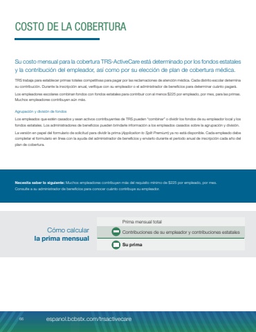 Su costo mensual para la cobertura TRS%u2011ActiveCare est%u00e1 determinado por los fondos estatales y la contribuci%u00f3n del empleador, as%u00ed como por su elecci%u00f3n de plan de cobertura m%u00e9dica.TRS trabaja para establecer primas totales competitivas para pagar por las reclamaciones de atenci%u00f3n m%u00e9dica. Cada distrito escolar determina su contribuci%u00f3n. Durante la inscripci%u00f3n anual, verifique con su empleador o el administrador de beneficios para determinar cu%u00e1nto pagar%u00e1.Los empleadores escolares combinan fondos con fondos estatales para contribuir con al menos $225 por empleado, por mes, para las primas. Muchos empleadores contribuyen a%u00fan m%u00e1s.Agrupaci%u00f3n y divisi%u00f3n de fondosLos empleados que est%u00e9n casados y sean activos contribuyentes de TRS pueden %u201ccombinar%u201d o dividir los fondos de su empleador local y los fondos estatales. Los administradores de beneficios pueden brindarle informaci%u00f3n a los empleados casados sobre la agrupaci%u00f3n y divisi%u00f3n.La versi%u00f3n en papel del formulario de solicitud para dividir la prima (Application to Split Premium) ya no est%u00e1 disponible. Cada empleado debe completar el formulario en l%u00ednea con la ayuda del administrador de beneficios y enviarlo durante el per%u00edodo anual de inscripci%u00f3n cada a%u00f1o del plan de cobertura.COSTO DE LA COBERTURANecesita saber lo siguiente: Muchos empleadores contribuyen m%u00e1s del requisito m%u00ednimo de $225 por empleado, por mes. Consulte a su administrador de beneficios para conocer cu%u00e1nto contribuye su empleador.C%u00f3mo calcular la prima mensualPrima mensual totalContribuciones de su empleador y contribuciones estatalesSu prima66 espanol.bcbstx.com/trsactivecare